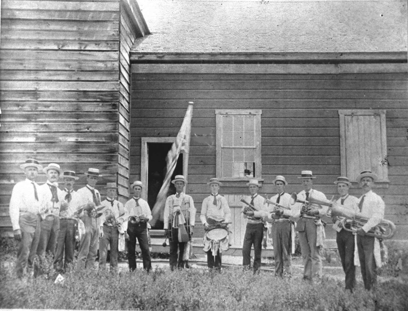 Kaysville Brass Band standing in front of early town music hall.Photograph Details