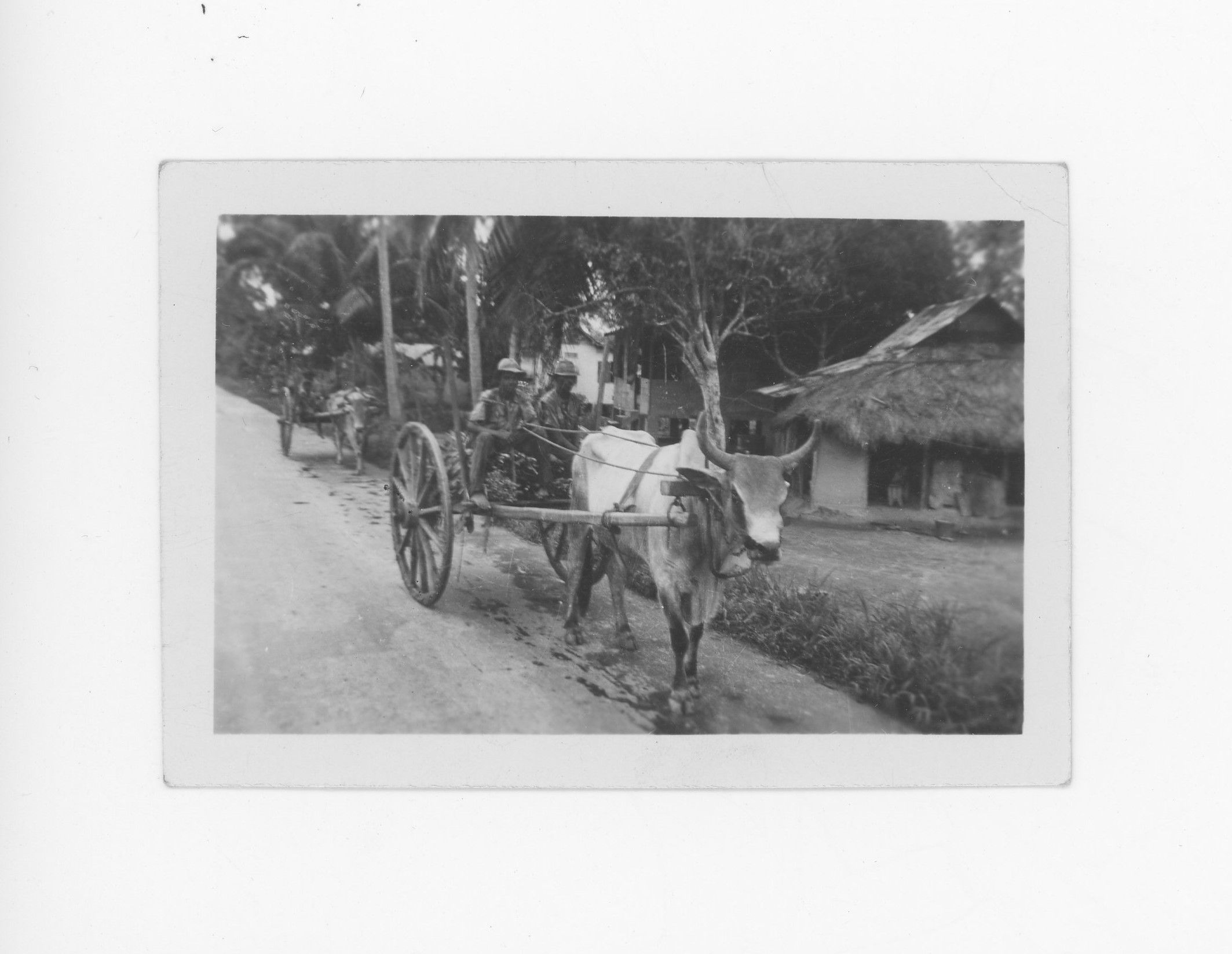 Two Filipino men sitting in a wagon being pulled by a bull or steer.Context