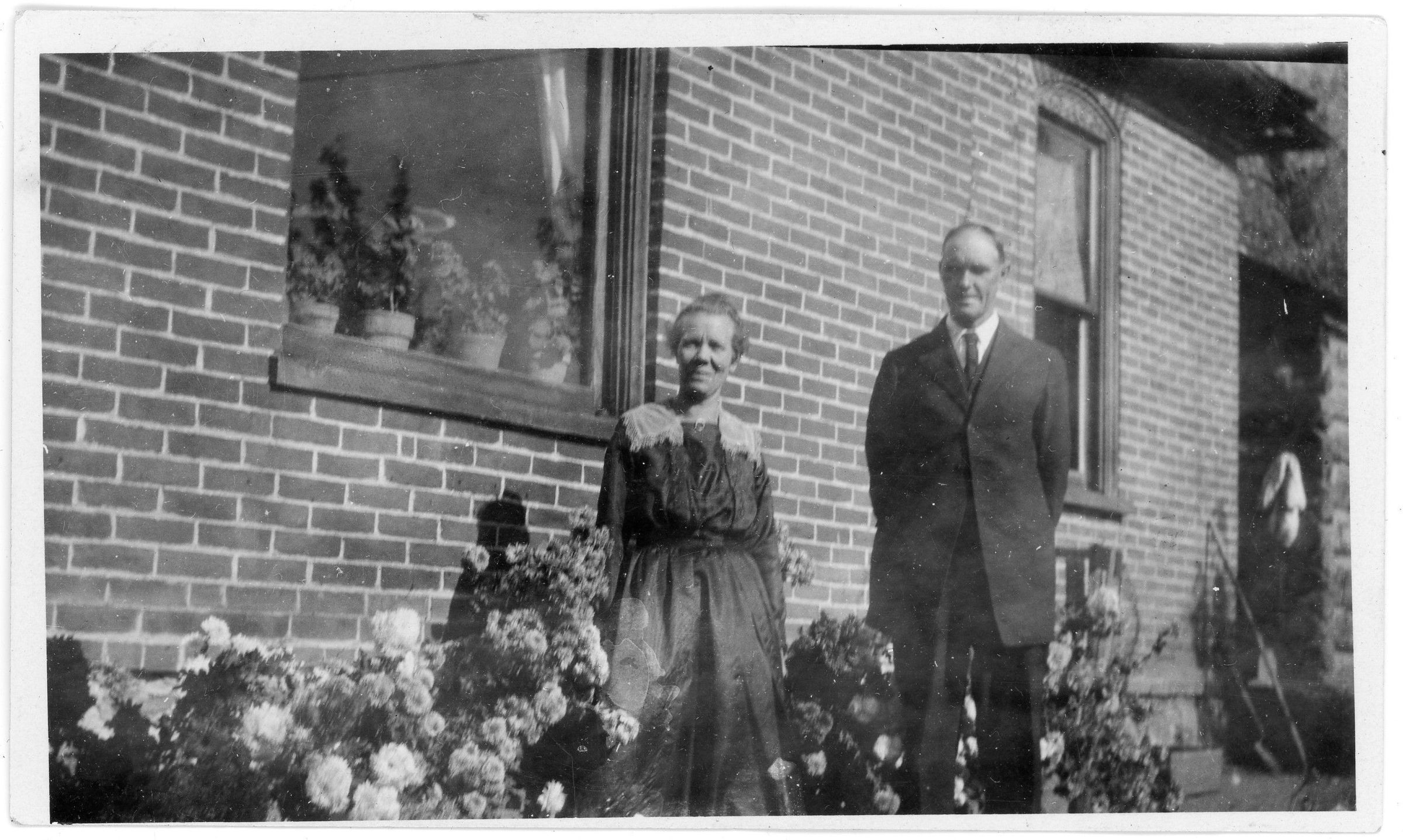 Robert Ward and his wife Mary Ann Haddon Ward standing outside home in east Kaysville, later Fruit Heights.