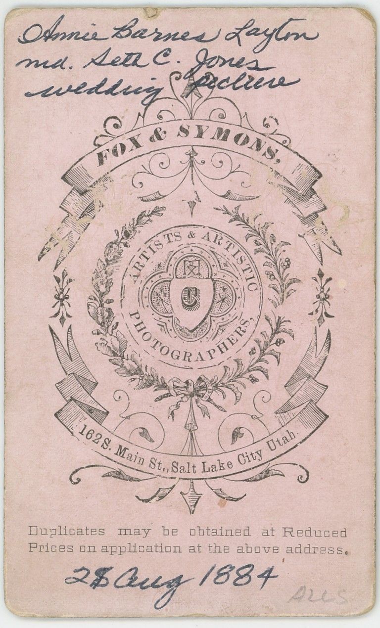 Wedding photo of Annie Barnes Layton who married Seth Chauncey Jones. Both were of Kaysville.Collection