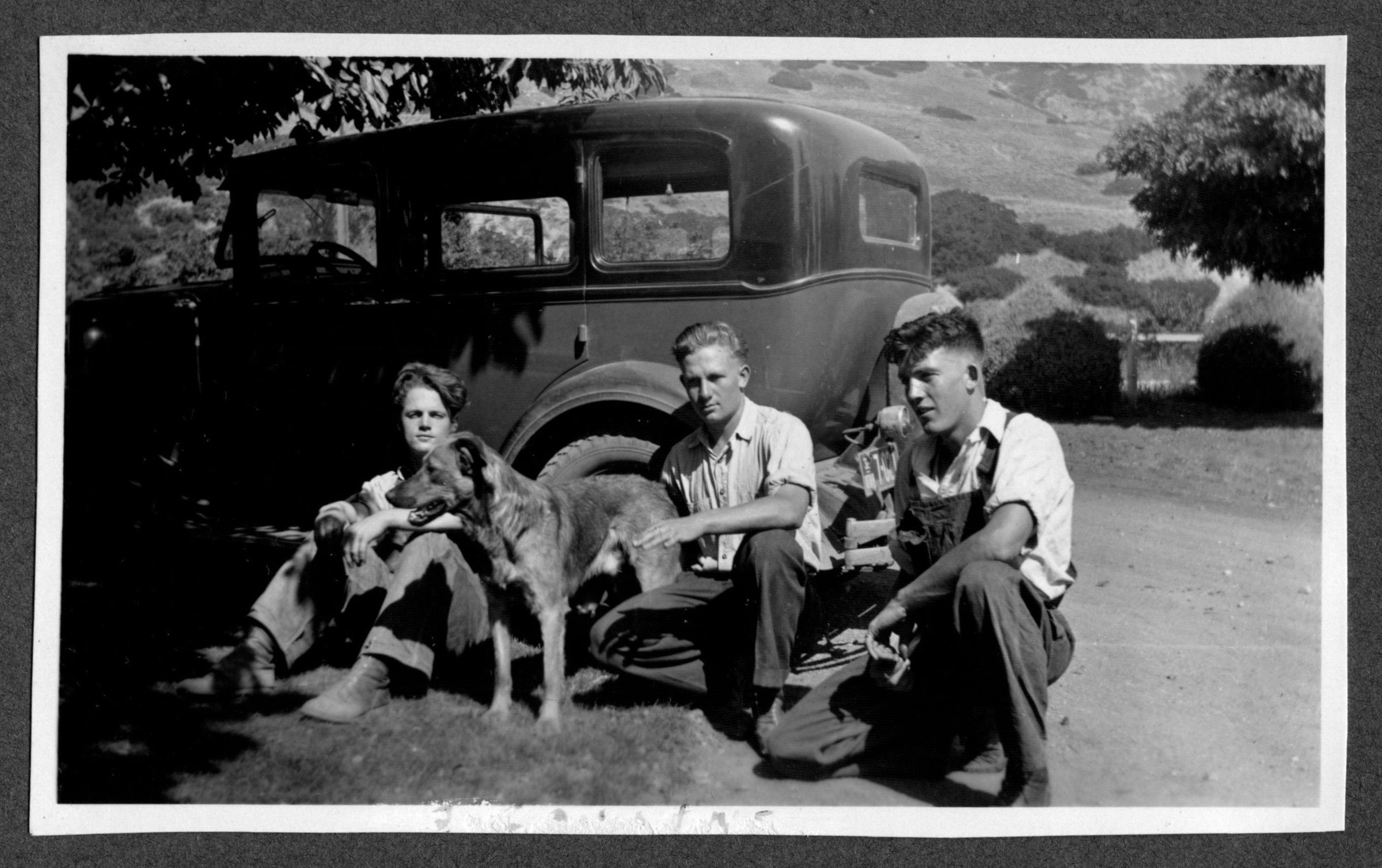 L to R: Sam Raymond, Garn Butcher, ________ near car on Butcher property, Mountain Road in east Kaysville/Fruit Heights.Photograph Details