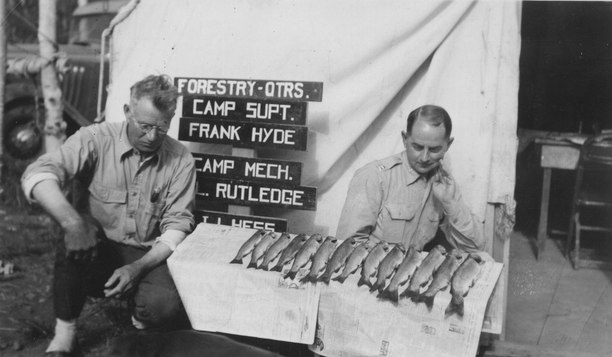 Frank Hyde, left, and fellow Civilian Conservation Corps employee display fishing trip catch outside tent headquarters.Photograph Details