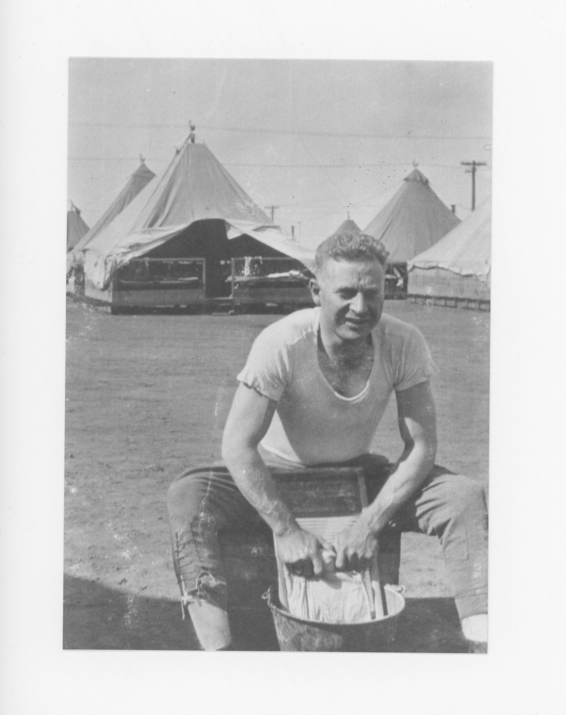 Man washing clothes with a bucket and washboard at a Utah CCC camp. There are large tents in the background.Context