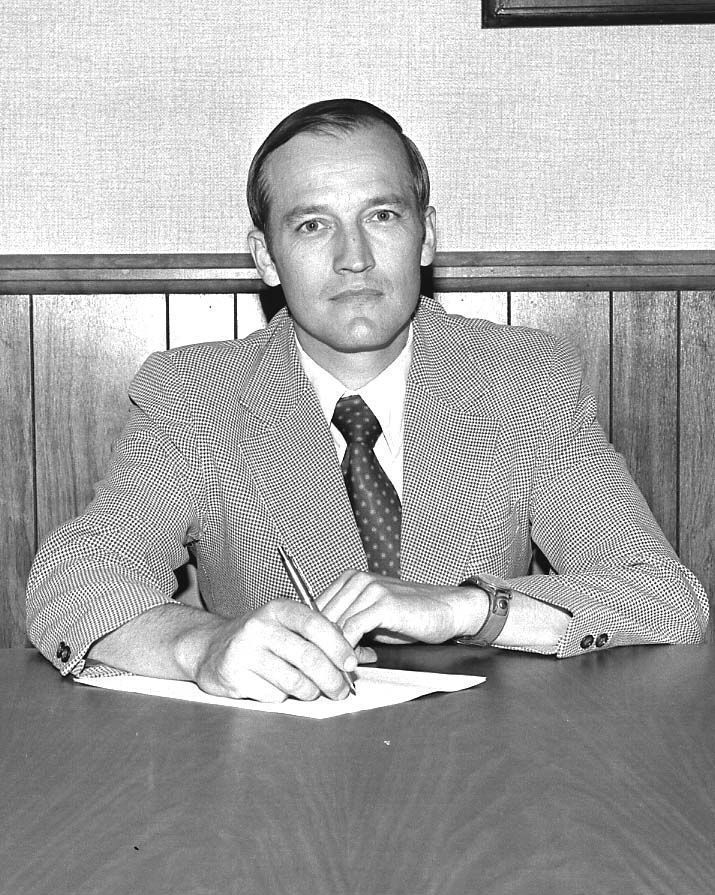 Man wearing a suit sitting at a table with paper and pen.Photograph Details