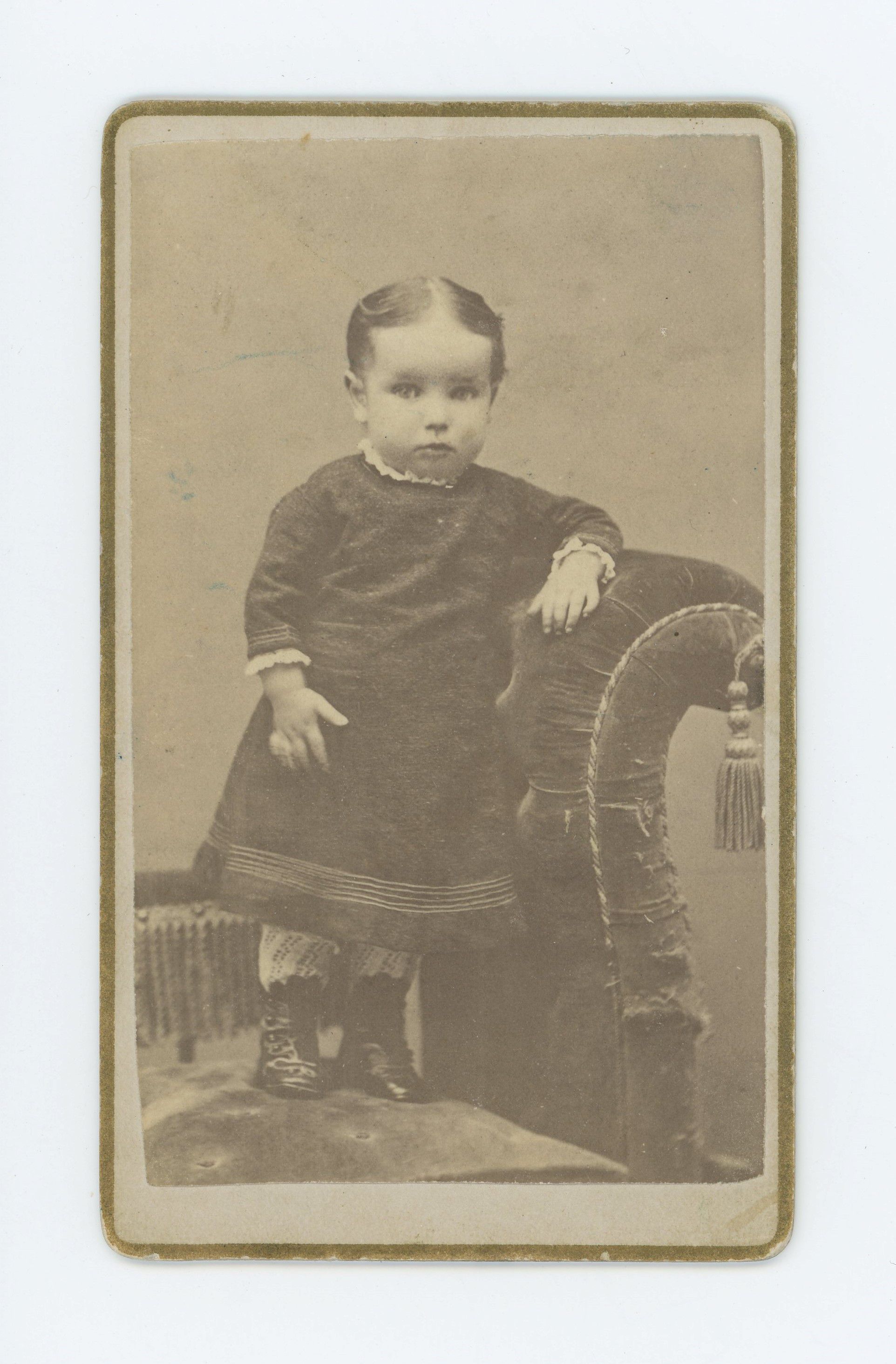 Portrait of young child standing on couch and wearing dark colored dress.Photograph Details