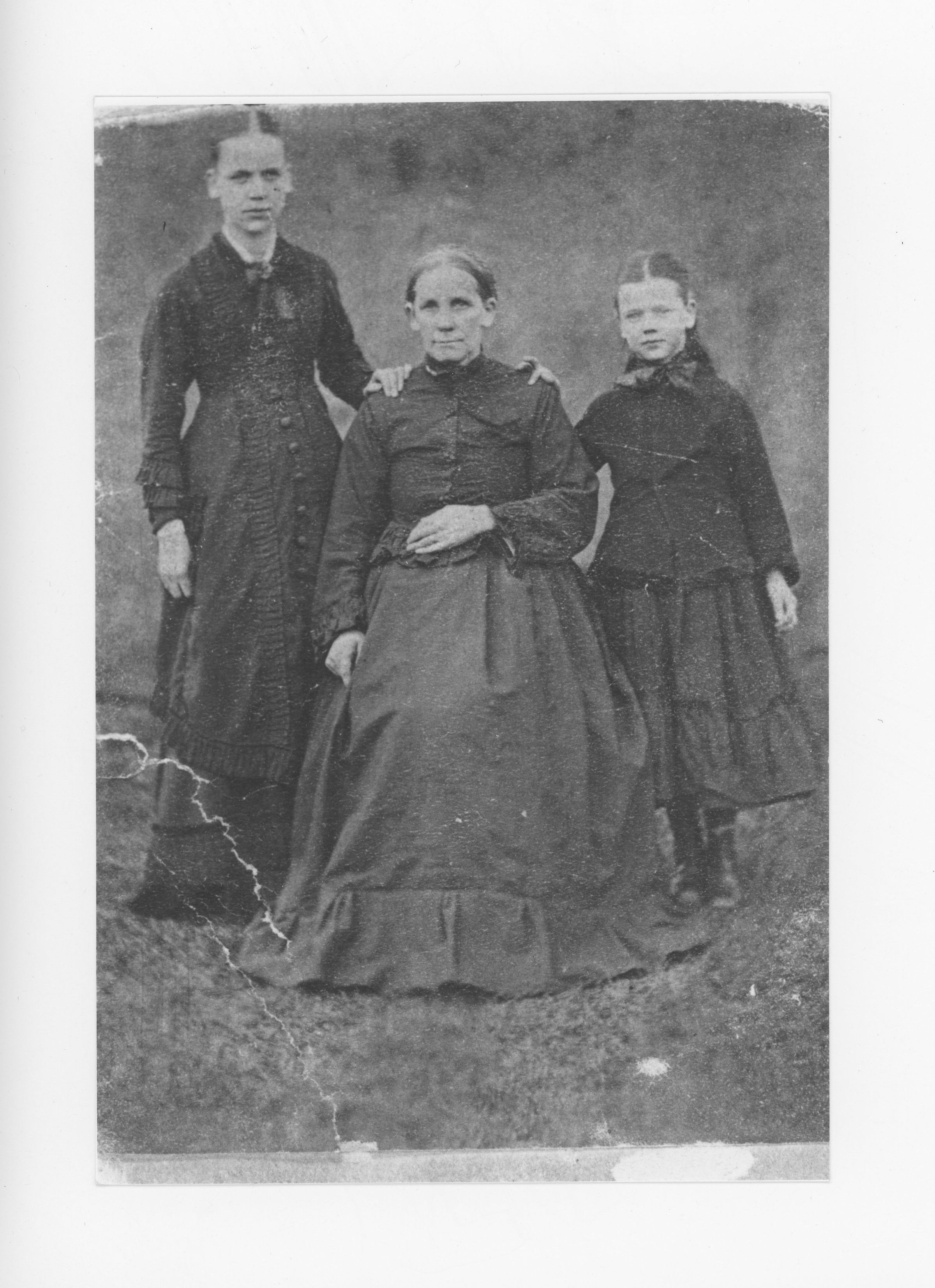Mahala Eliza Bacon sits in the center with her two daughters, Rose Hannah, left, and Lucy, right, standing behind with their hands on her shoulders. They are all wearing black dresses.Photograph Details