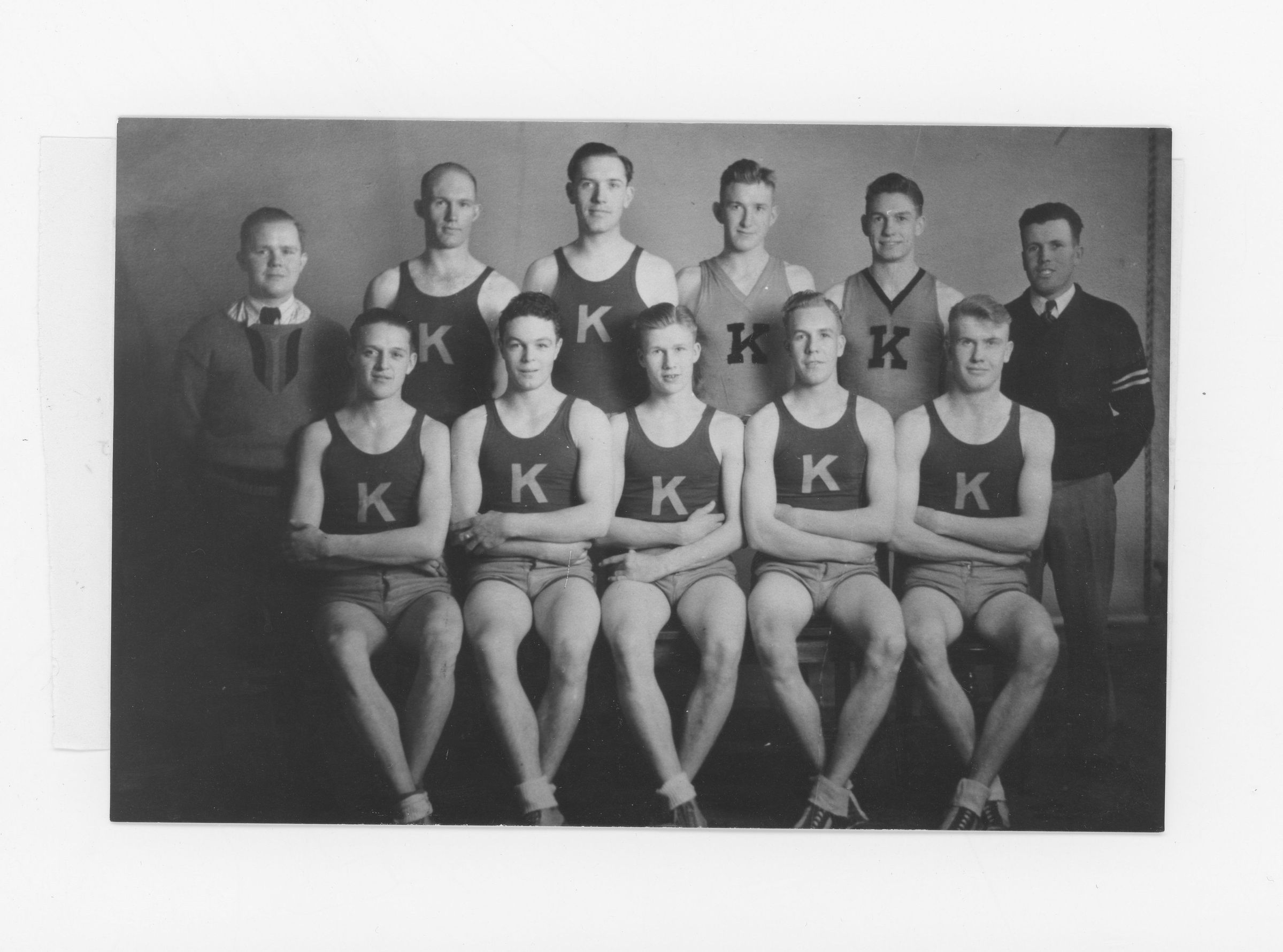 Nine young men on Kaysville basketball team. The coach and assistant coach stand on either side.Context