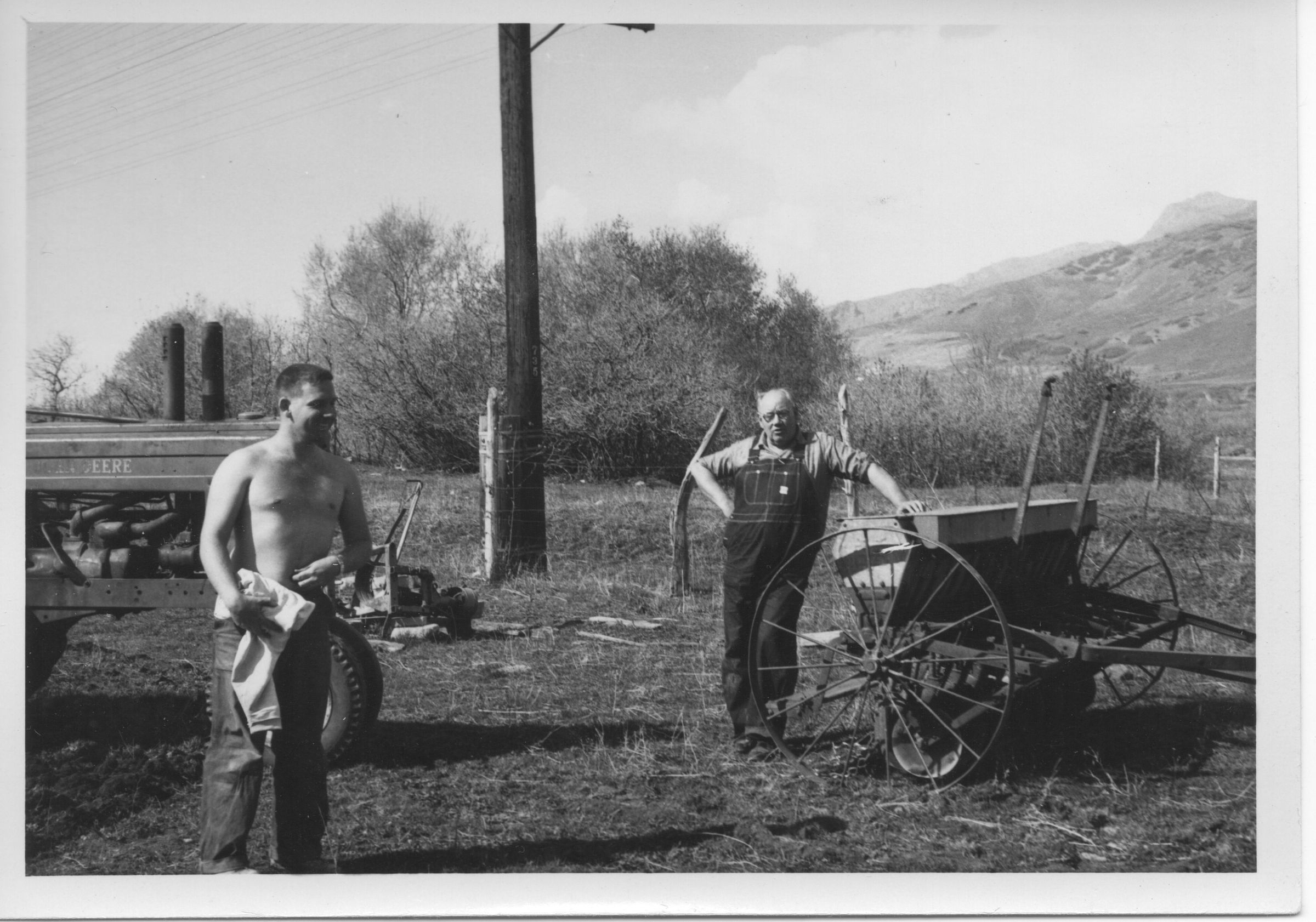 Malcolm and Alpheus Harvey, leaning against planting seeder, are seen working on the family farm west of Highway 89 and in the field located on the south side of Dry Hollow.Photograph Details