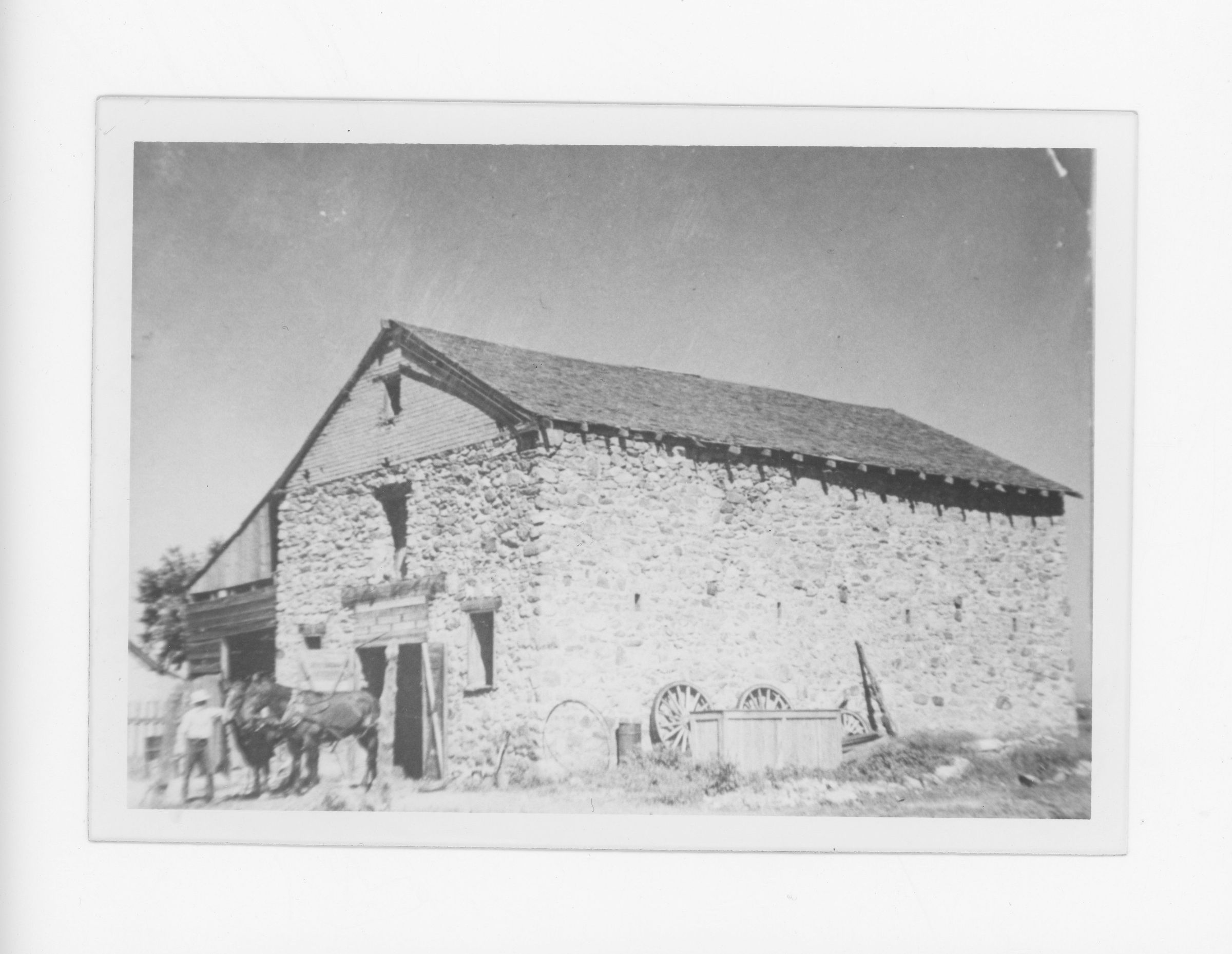 Stone barn with a man and horses out front. The barn was owned by the Weinel Family of Kaysville.Context