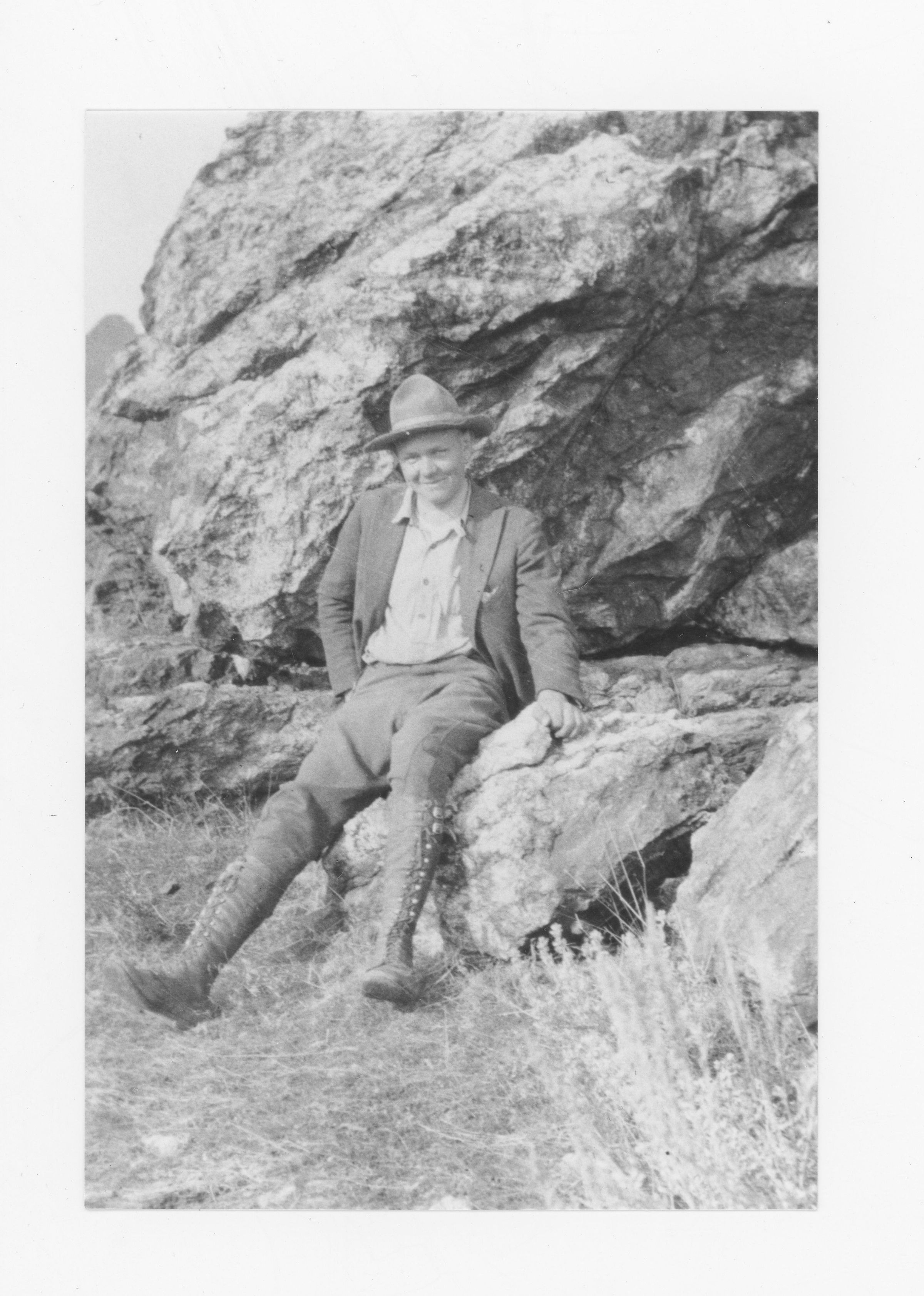 Elmer Ward sitting on rock. He is probably shown hiking on the bench above Kaysville or on Antelope Island.Photograph Details