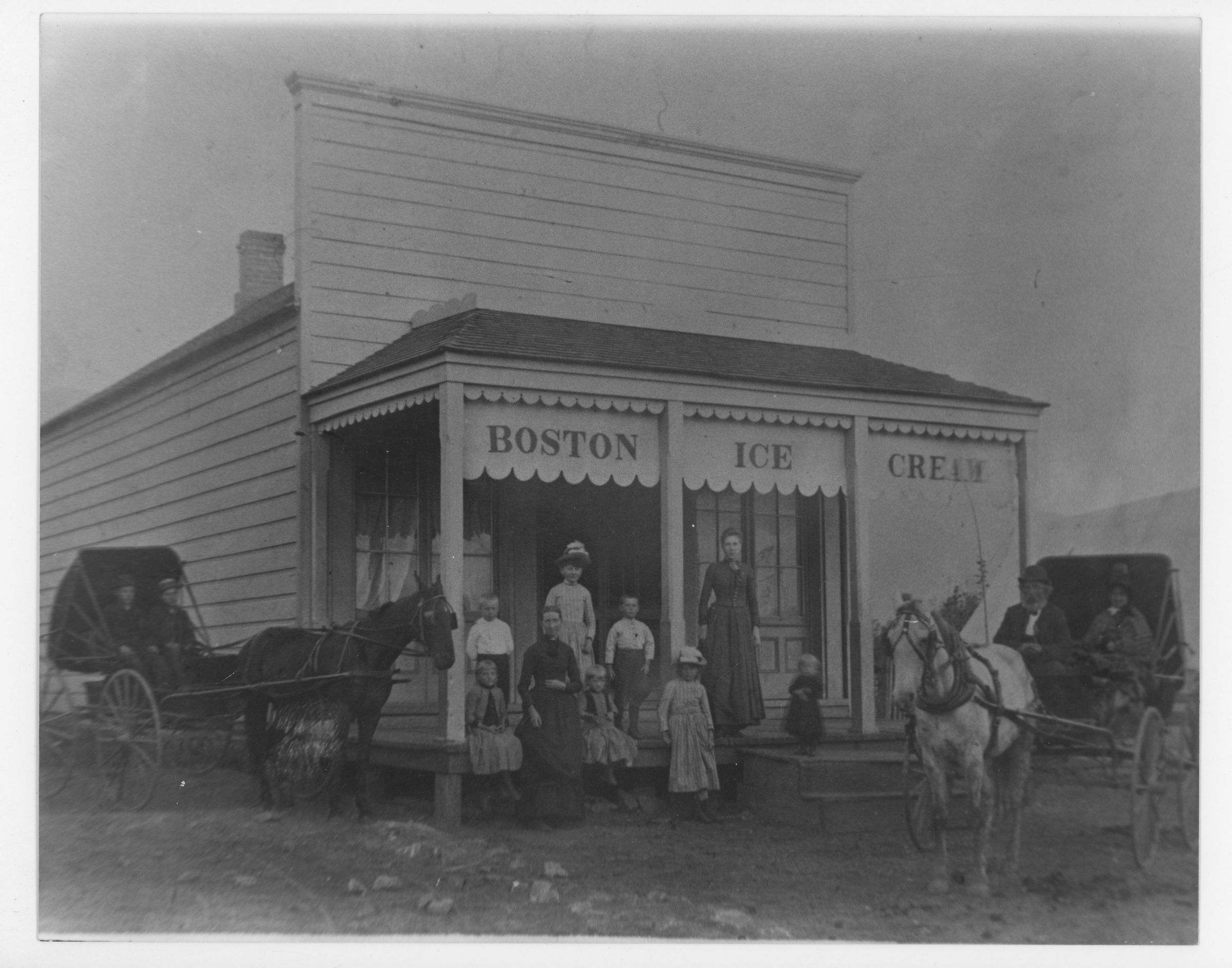 Phillips Family group standing outside Lewis Ice Cream parlor on the east side of Kaysville's historic Main Street. Pioneers Edward and Annie Phillips are sitting in the horse-led buggy on the right.Photograph Details