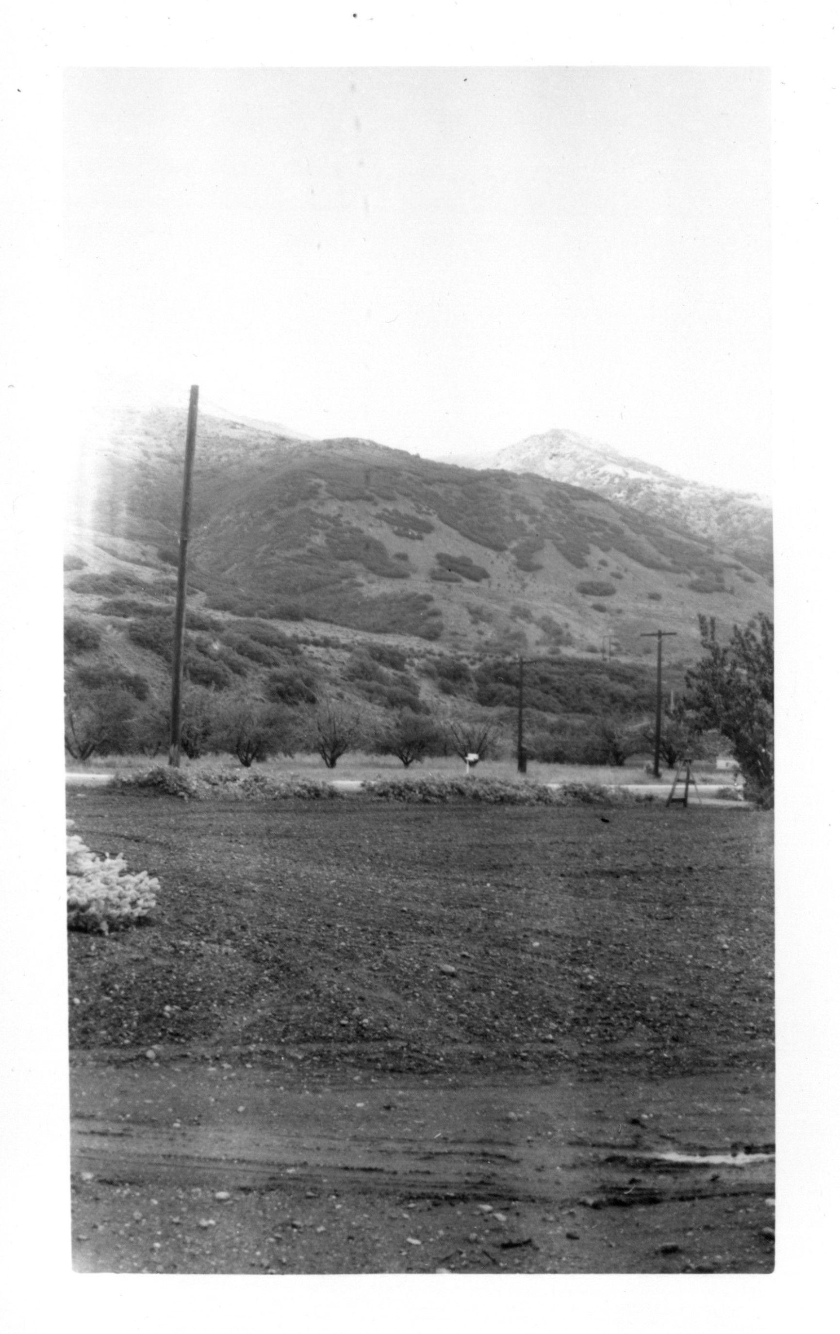Butcher's plowed field in foreground with orchard in background. Picking ladder stand next to fruit tree. Location is in east Kaysville, later Fruit Heights. Photograph viewpoint taken from back steps of Arthur Butcher home. Mountain Road in foreground.Photograph Details