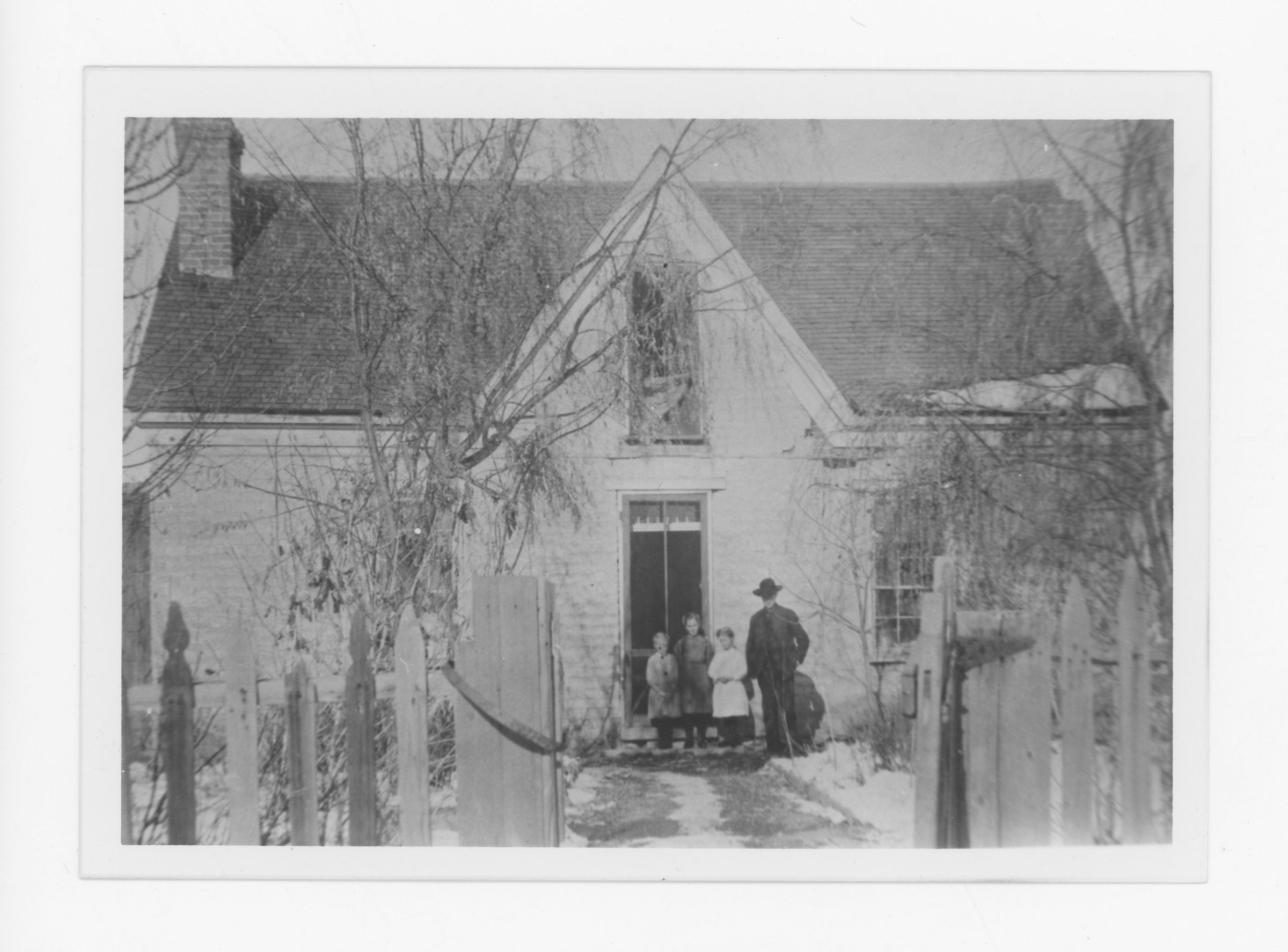Arthur Smith and his daughters standing outside of house surrounded by trees and a picket fence.Photograph Details