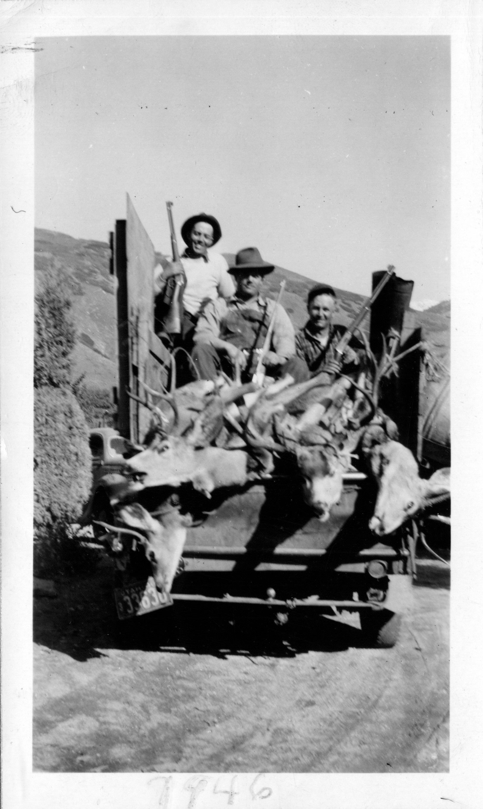 L to R: Vern Butcher, Sam Raymond, Carl Butcher in the back of a truck with guns and four dead deer.Photograph Details