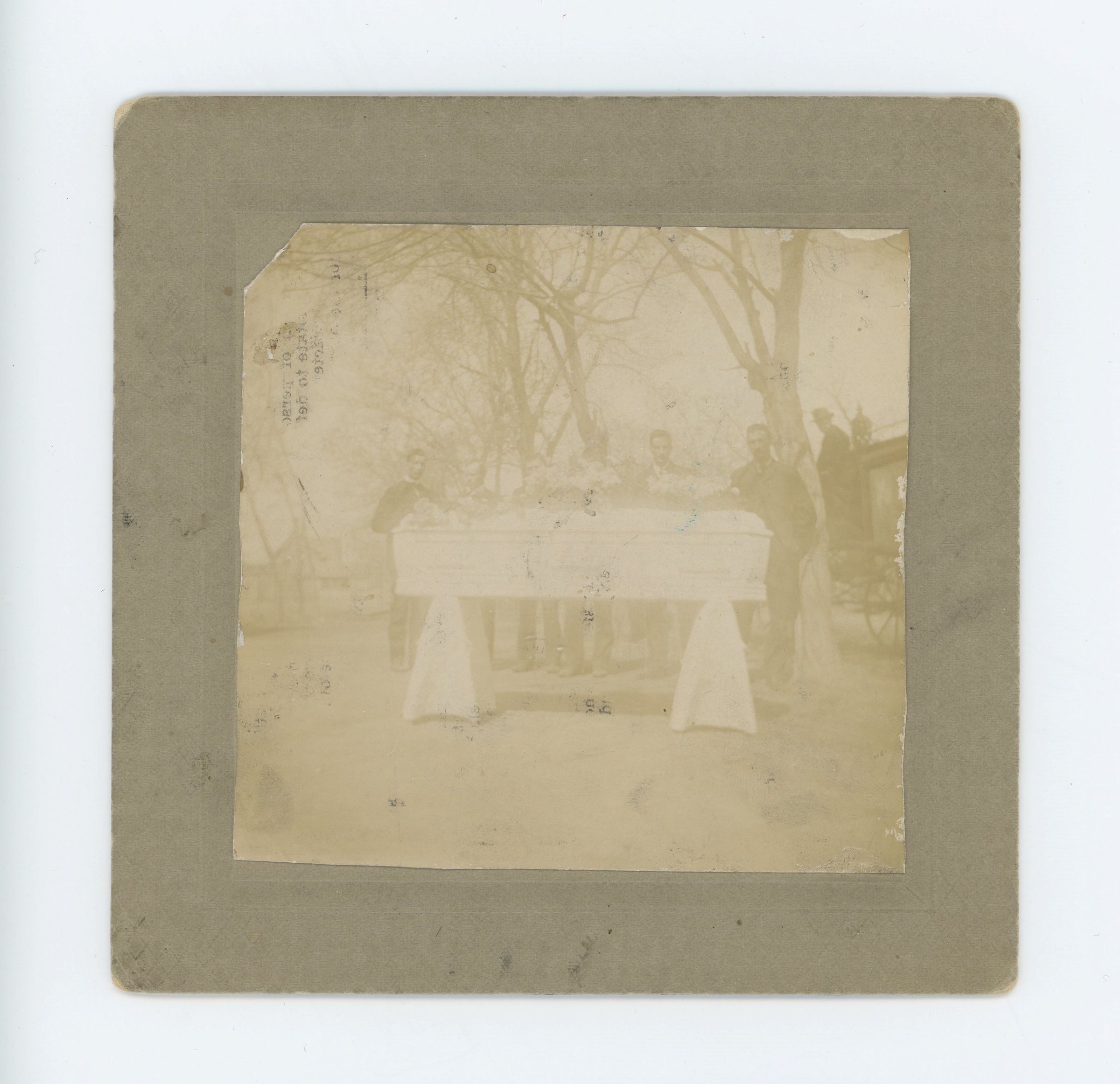 Group of men standing around a light-colored coffin which has been placed in the yard of the Bone Family of Kaysville.