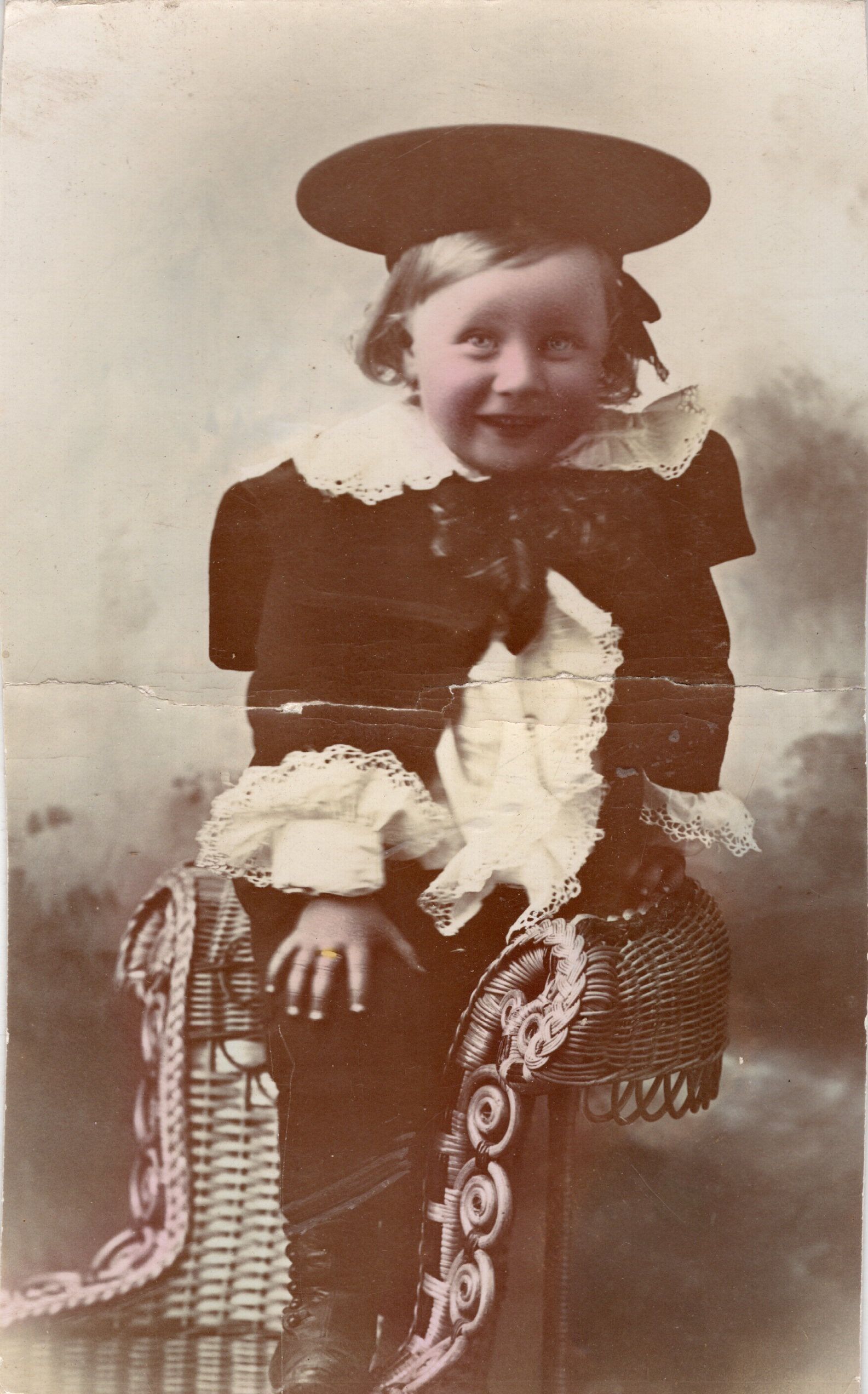 Grant Christensen Lewis is standing in wicker chair, wearing lace Little Lord Fauntleroy styled outfit including hat.Photograph Details