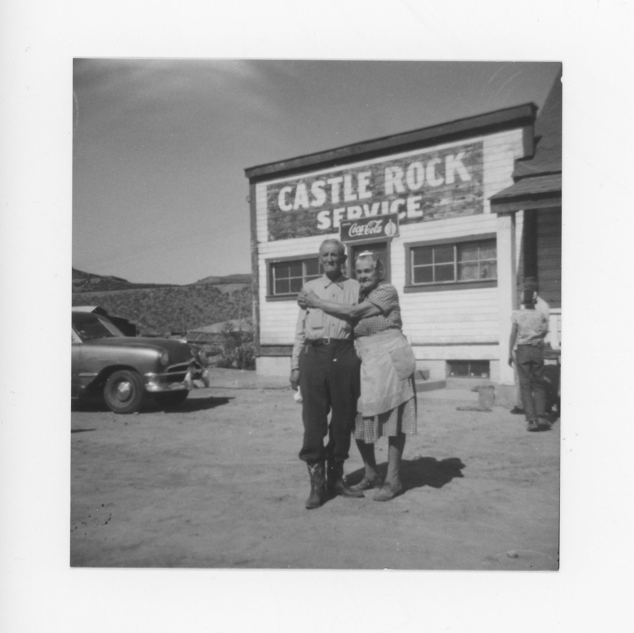 Man and woman, proprietors, outside of Castle Rock Service building.Collection