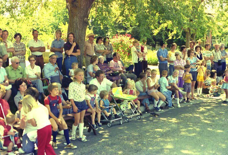 Large group of people gathered on the side of a street for an Independence Day parade at the bicentennial celebration.Collection