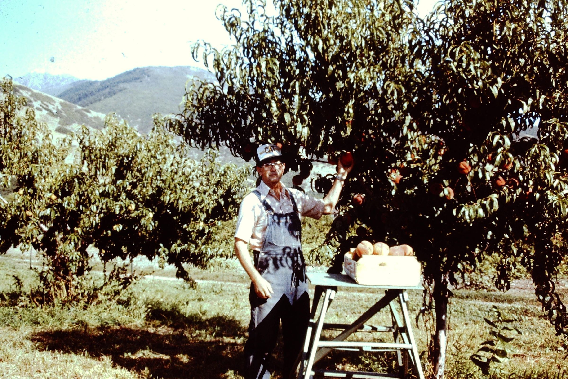Glenn Manning picking peaches in family orchard. Orchard is located in Fruit Heights.Photograph Details