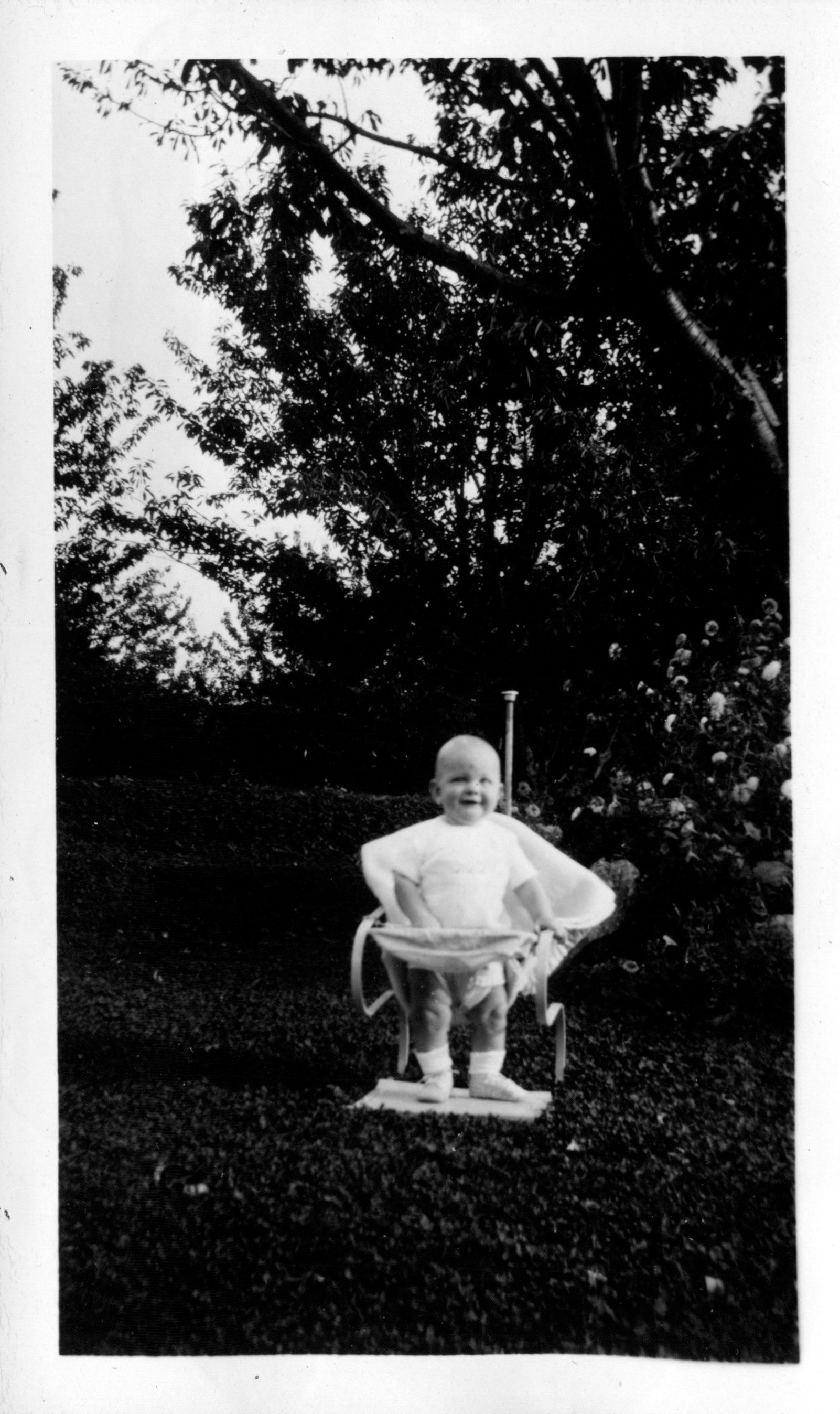 Garn Butcher sitting in bouncy chair outdoors on grass.Photograph Details