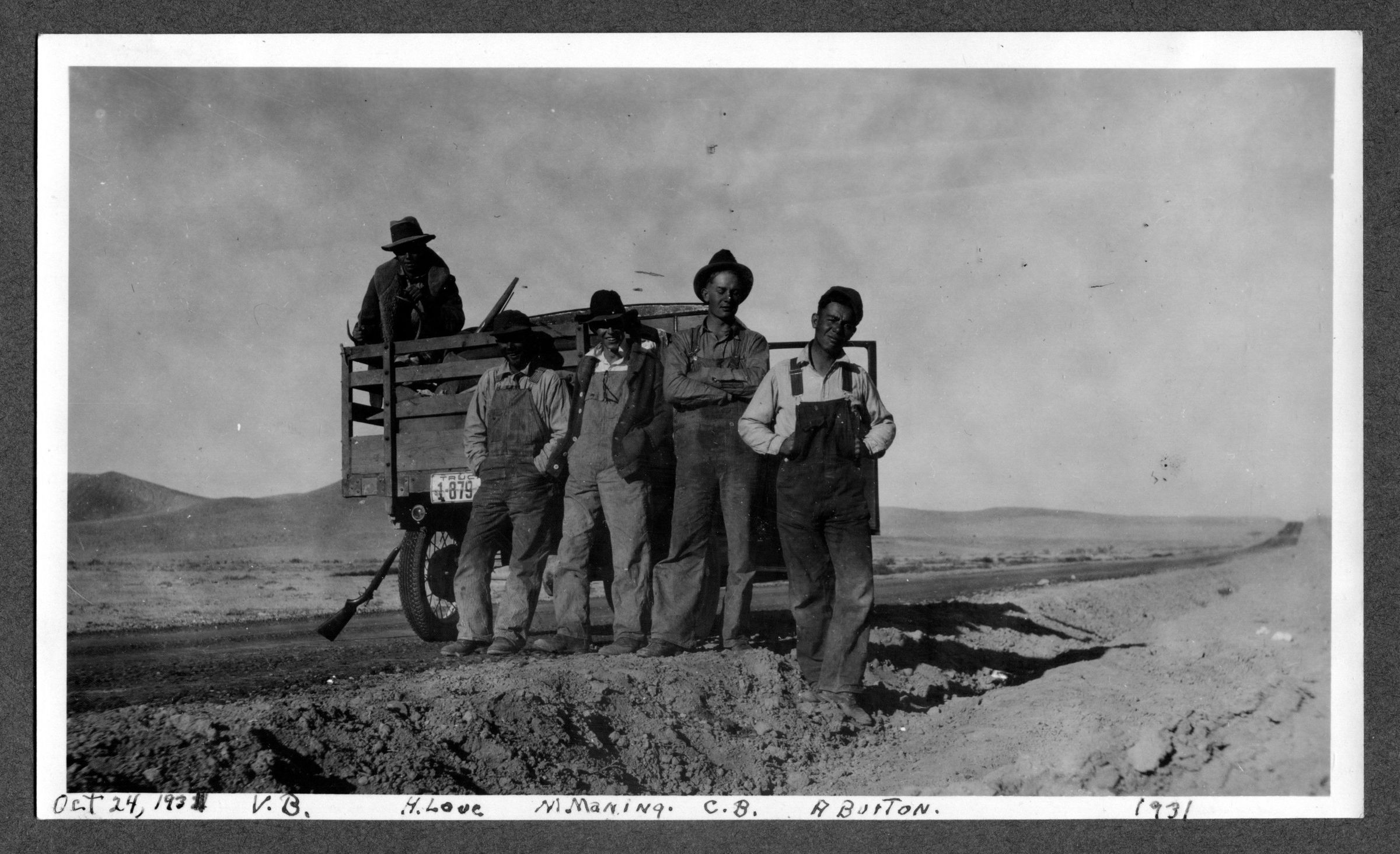 Butcher family friends on hunting trip. Left to right: V.B. (Vernon Butcher), H. Love, M. Maning (Myron Manning), C.B. (Carl Butcher), & A. Burton (Alden Burton).Photograph Details