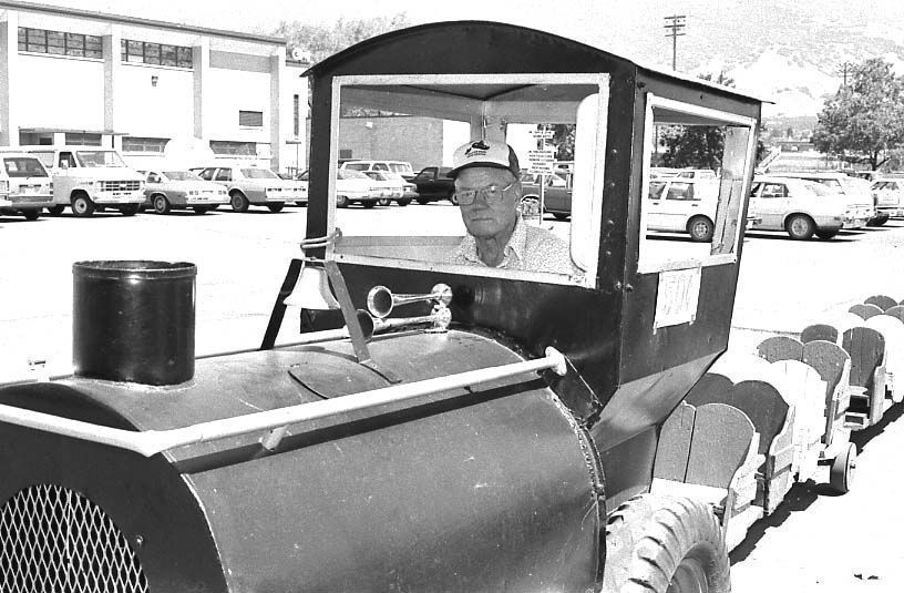 Man sitting in a tractor-driven train in a parking lot.Photograph Details