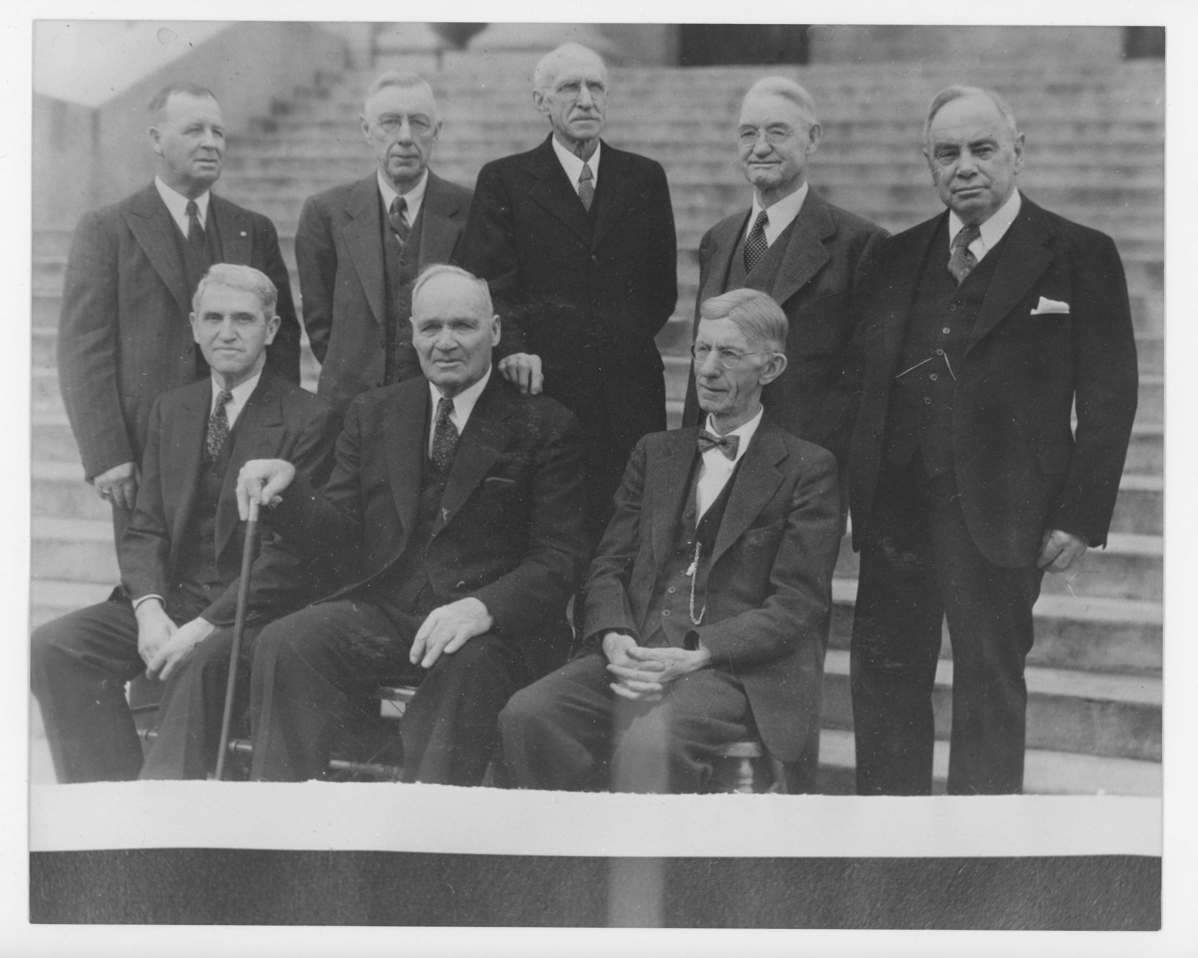 Front row (L-R) Seth Jones, John W. Thornley, Richard W. "Will" Barnes. Back row (L-R) Myron W. Phillips, J. Richard "Dick" Gailey. Dr. Sumner Gleason, Thomas E. Williams, George W. Barnes. Picture was taken on the front steps of the Kaysville LDS Tabernacle.Collection