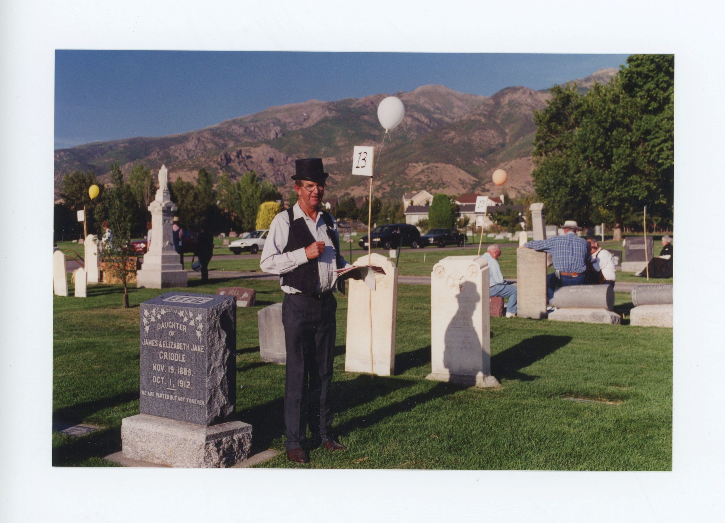 An event which was part of the Kaysville - Fruit Heights celebration of the Utah Centennial took place in 1996. The tour, hosted by the Kaysville - Fruit Heights Historic Committee, invited the public to visit historically significant gravesites in the city cemetery.Photograph Details