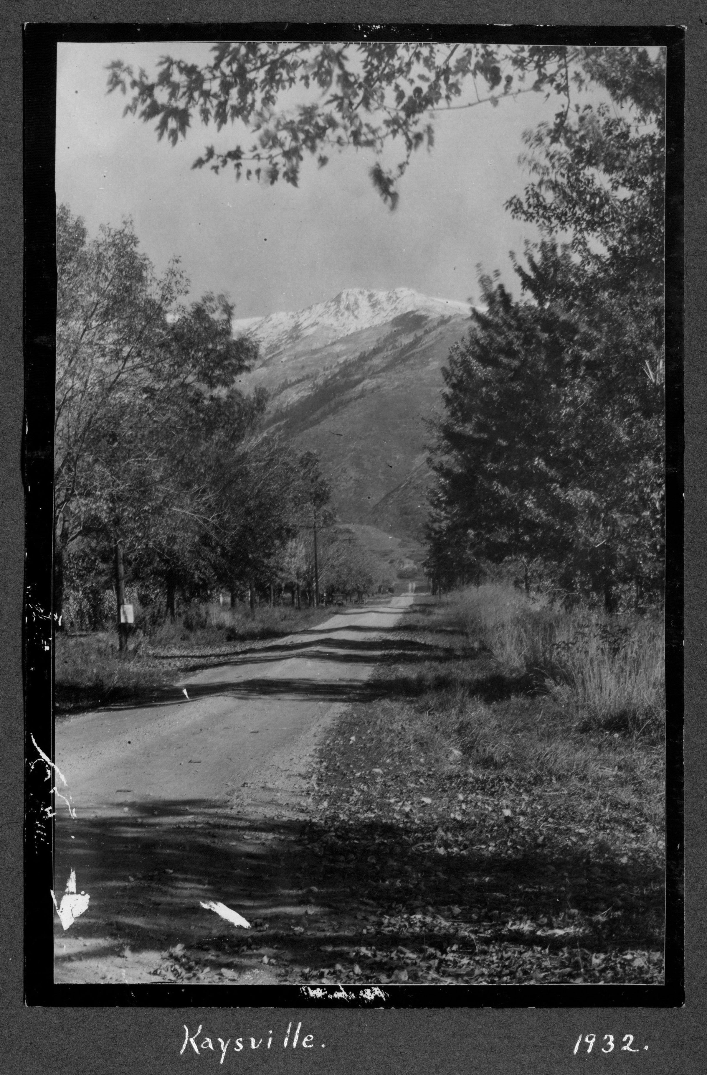 Dirt road in Kaysville lined with trees. Francis Peak in the distance would later have satellite towers mountain on the summit.Photograph Details