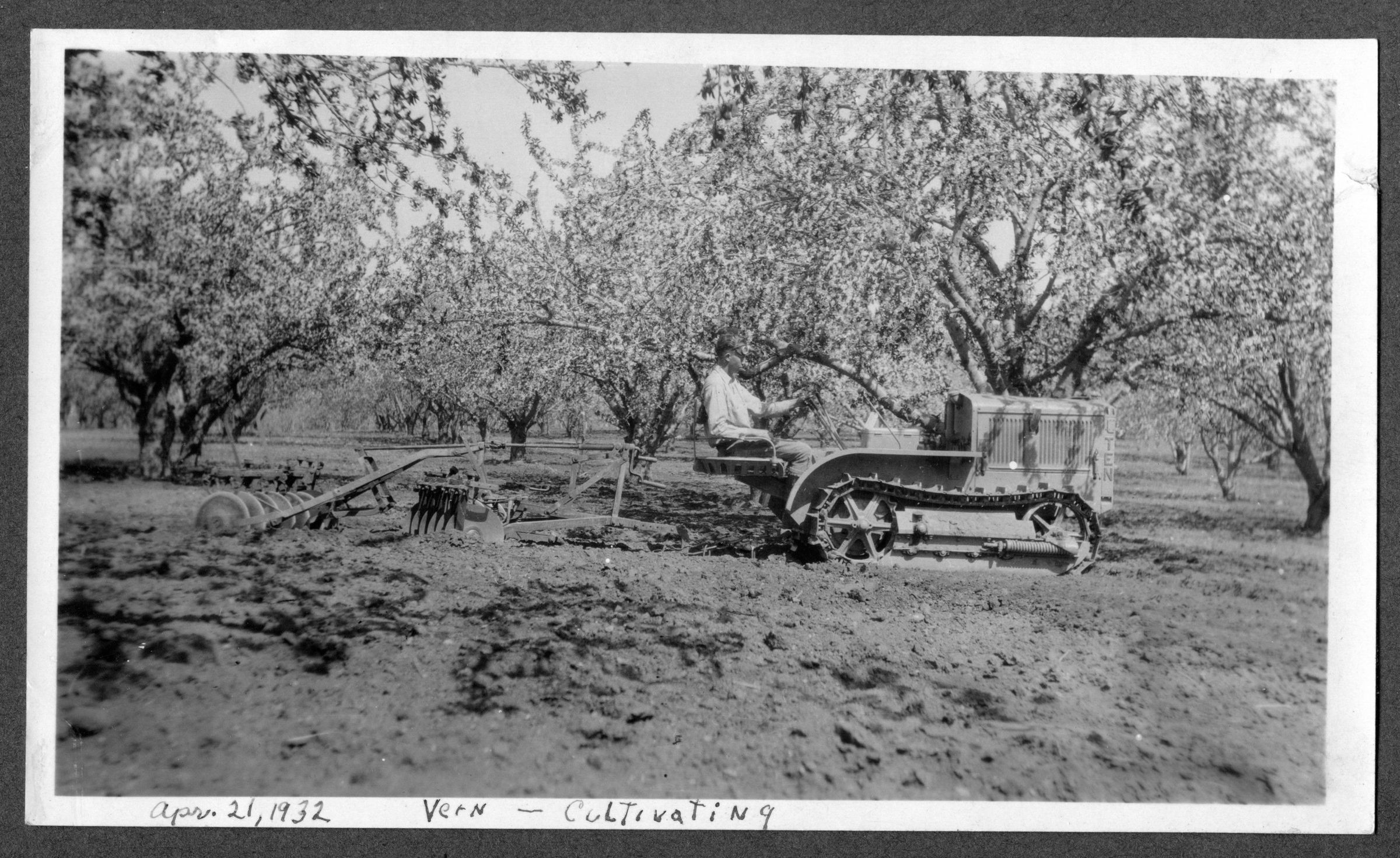 Vern Butcher driving cultivator in his east Kaysville orchard.Photograph Details