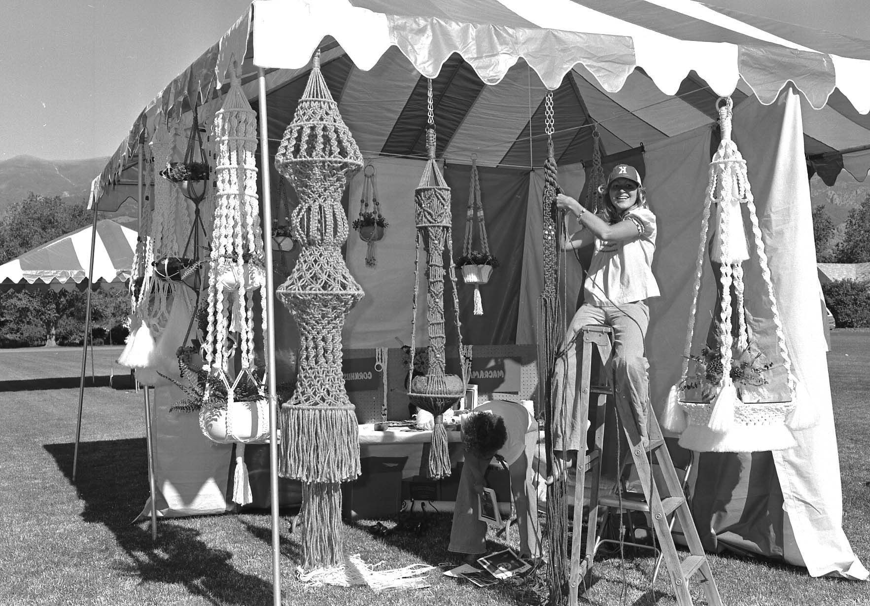Young woman demonstrates macrame techniques at a craft booth during the Kaysville bicentennial celebration.Photograph Details