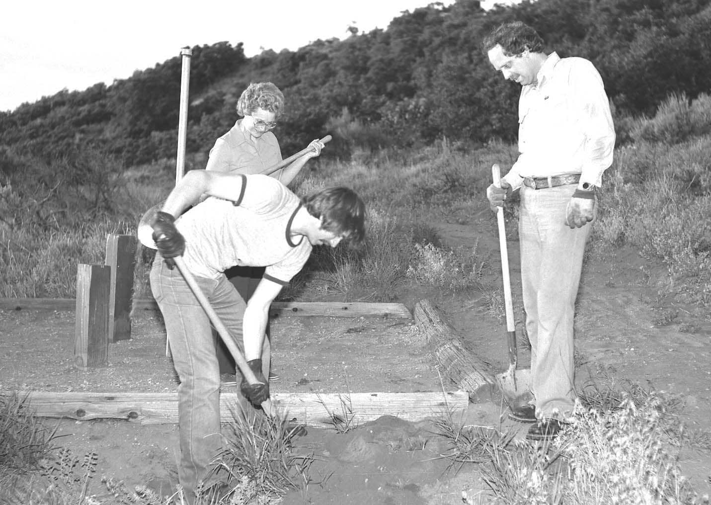 Kaysville JC's Corilla [Anderson] looks on as Dick Bushnell prepares a concrete form at mtn park jun 1979