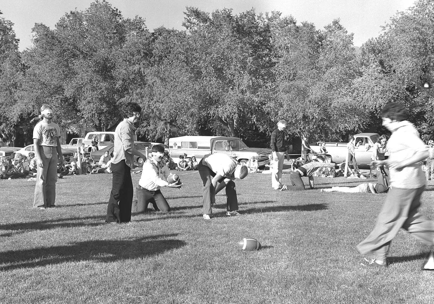 Attendees playing football while blindfolded as part of the Kaysville bicentennial celebration.Photograph Details