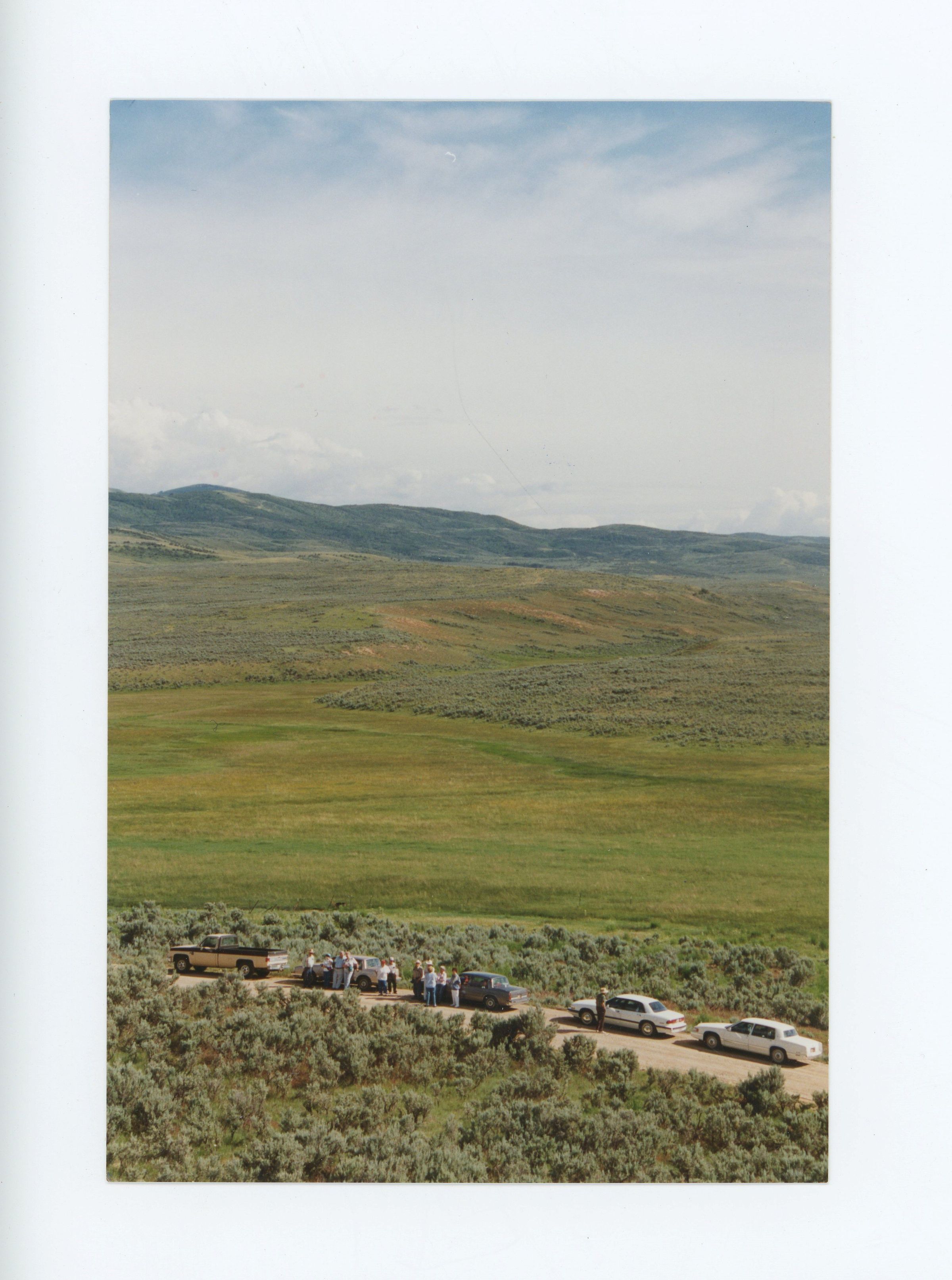 Members and guests of Sons of the Utah Pioneers Snow Horse Company stand by their cars parked along a dirt road below Cache Cave in Wyoming. Picture taken on Overland Trail Crossing Meadow below Cache CavePhotograph Details