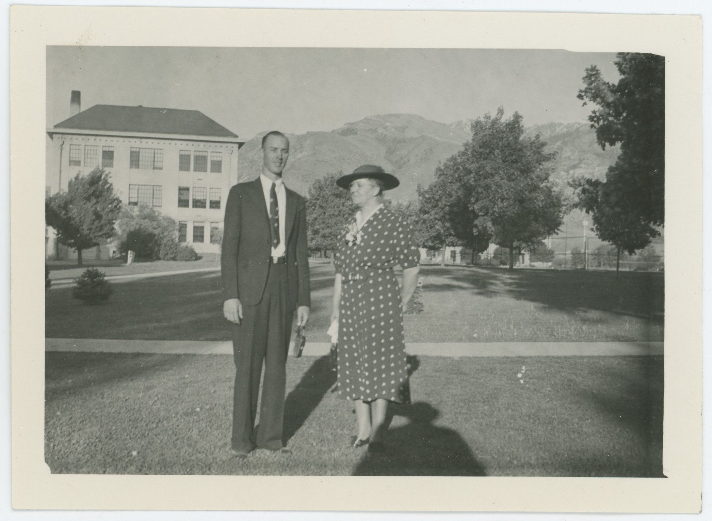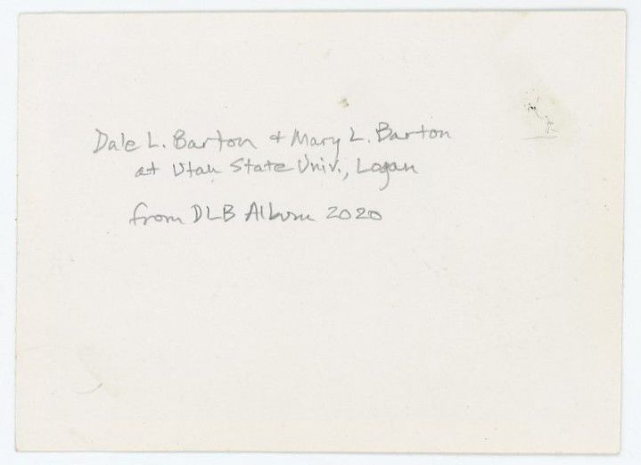 Dale A. Barton and Mary L. Barton standing on lawn of Utah State University campus.Photograph Details
