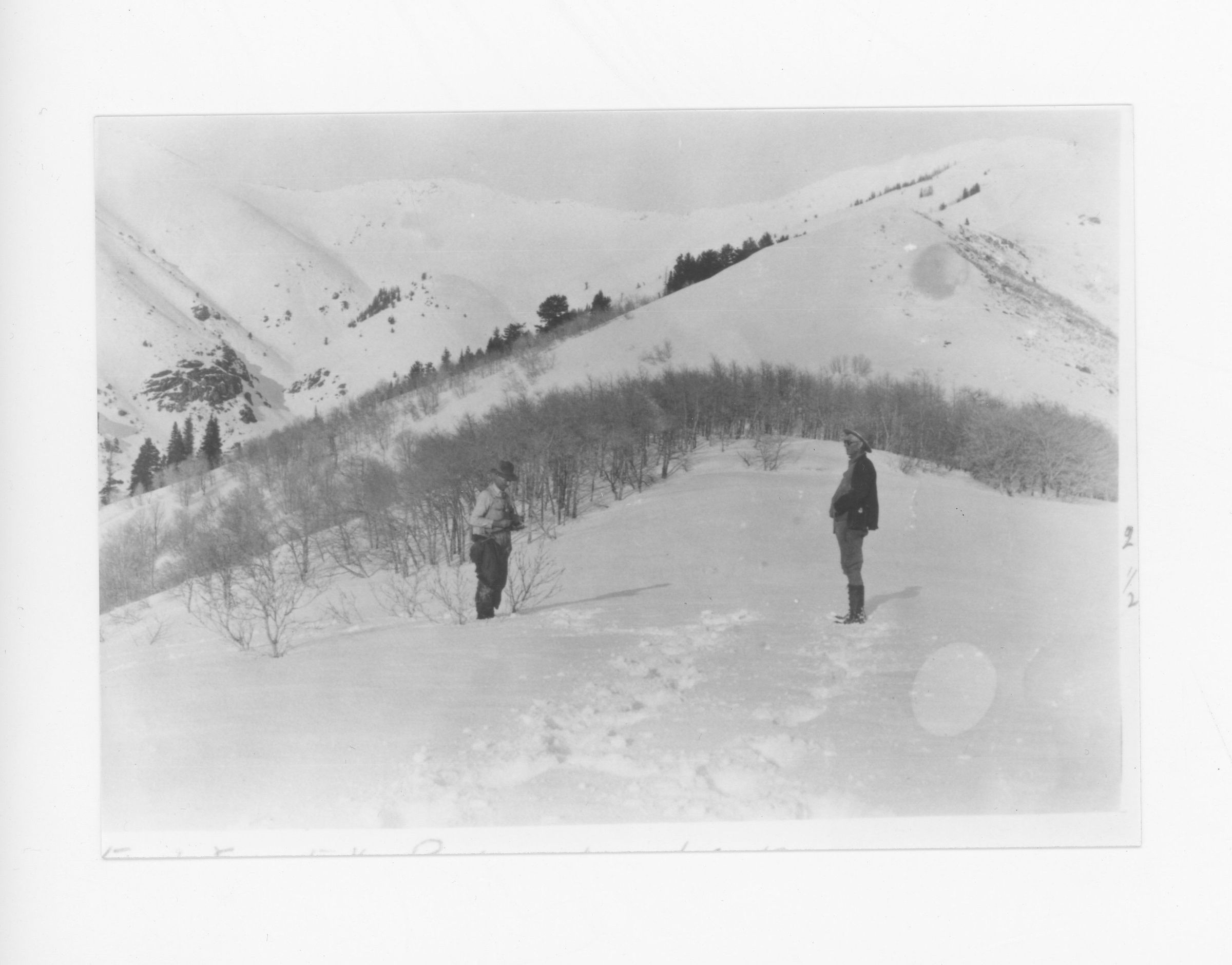 Arthur Butcher and Sumner Gleason standing in the snow on mountain above Kaysville.Photograph Details