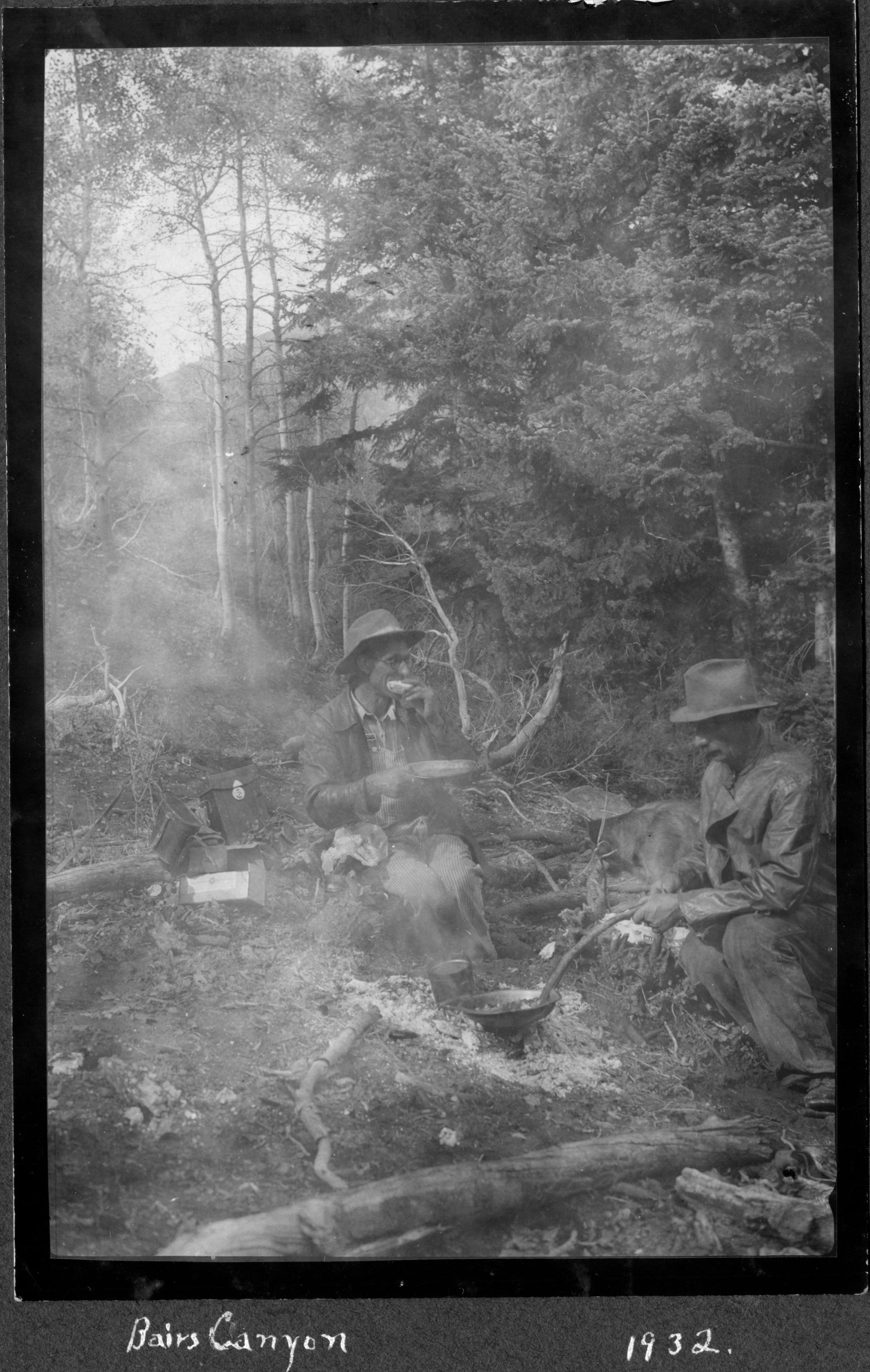 Lester Gleason and Arthur Butcher camping in Bair Canyon. The canyon is situated above east Kaysville, later Fruit Heights.Photograph Details