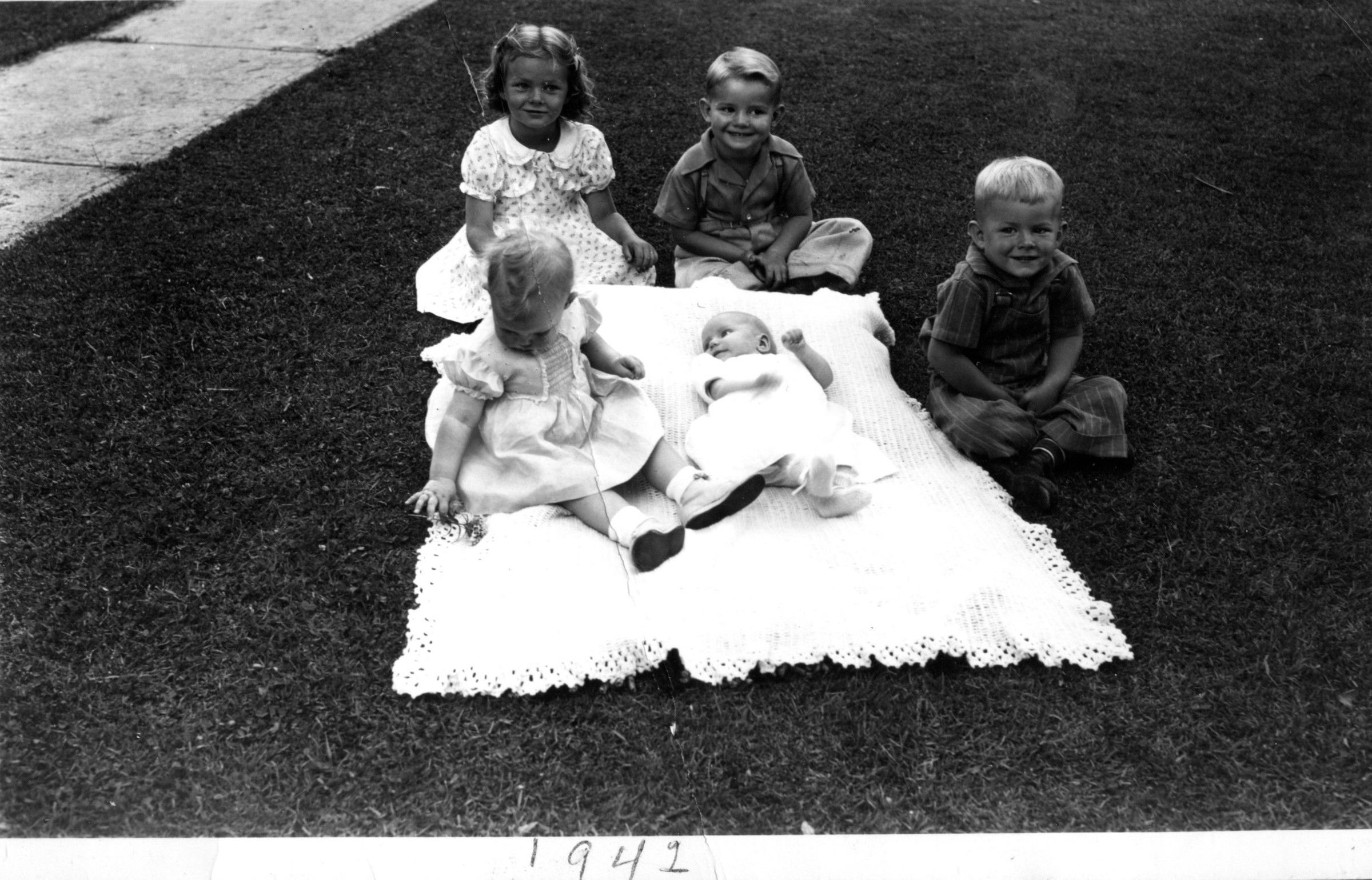 Five children sitting on a blanket outside on grass.Photograph Details