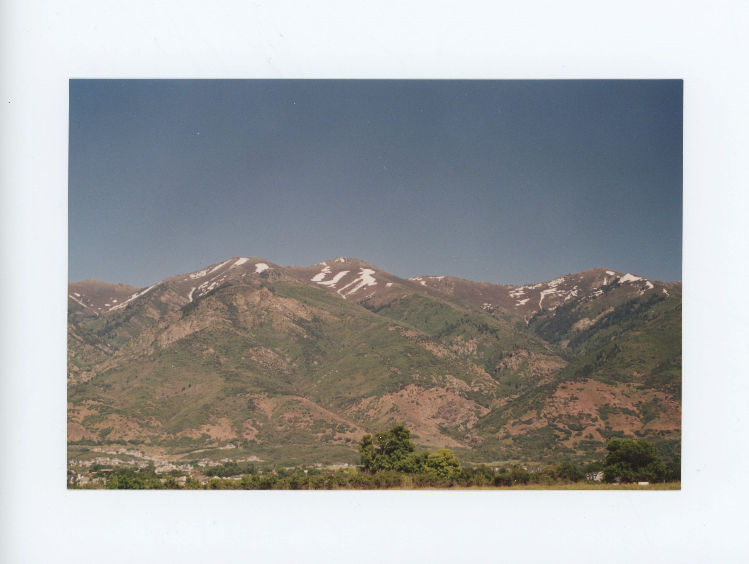 Brown and green mountains with clear blue skies. Tops of trees are visible at the base of the mountain.
