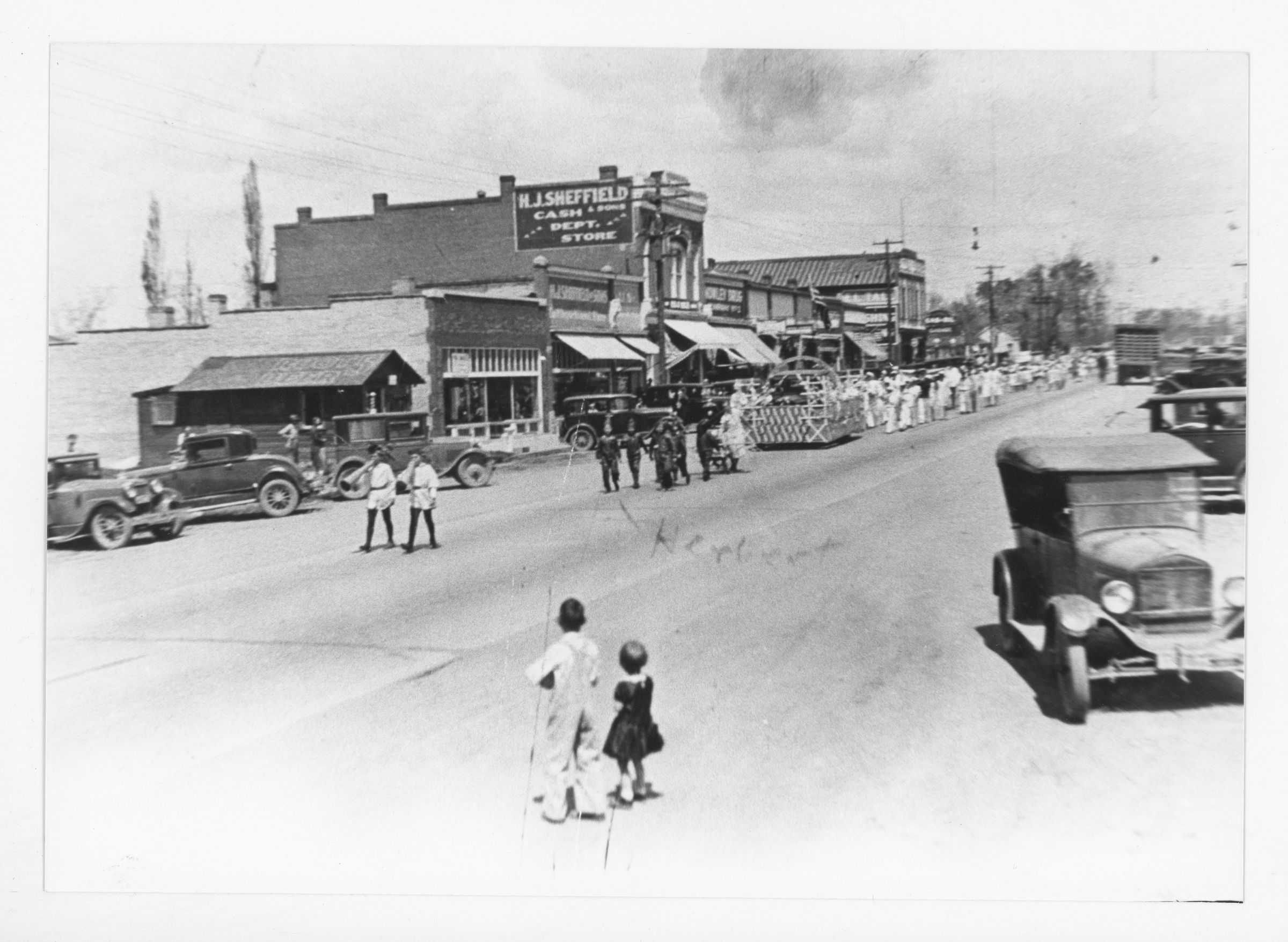 Parades & processions, Fourth of July celebrations, Floats (Parades), Vehicles, Children, Trucks, Uniforms, Instruments, Musical, Department stores, Buildings, Business & finance, Business enterprises, Power lines