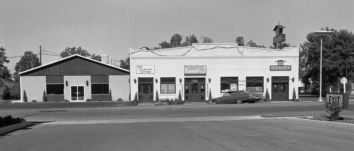 Store building with car in the parking lot and trees in the background.Photograph Details