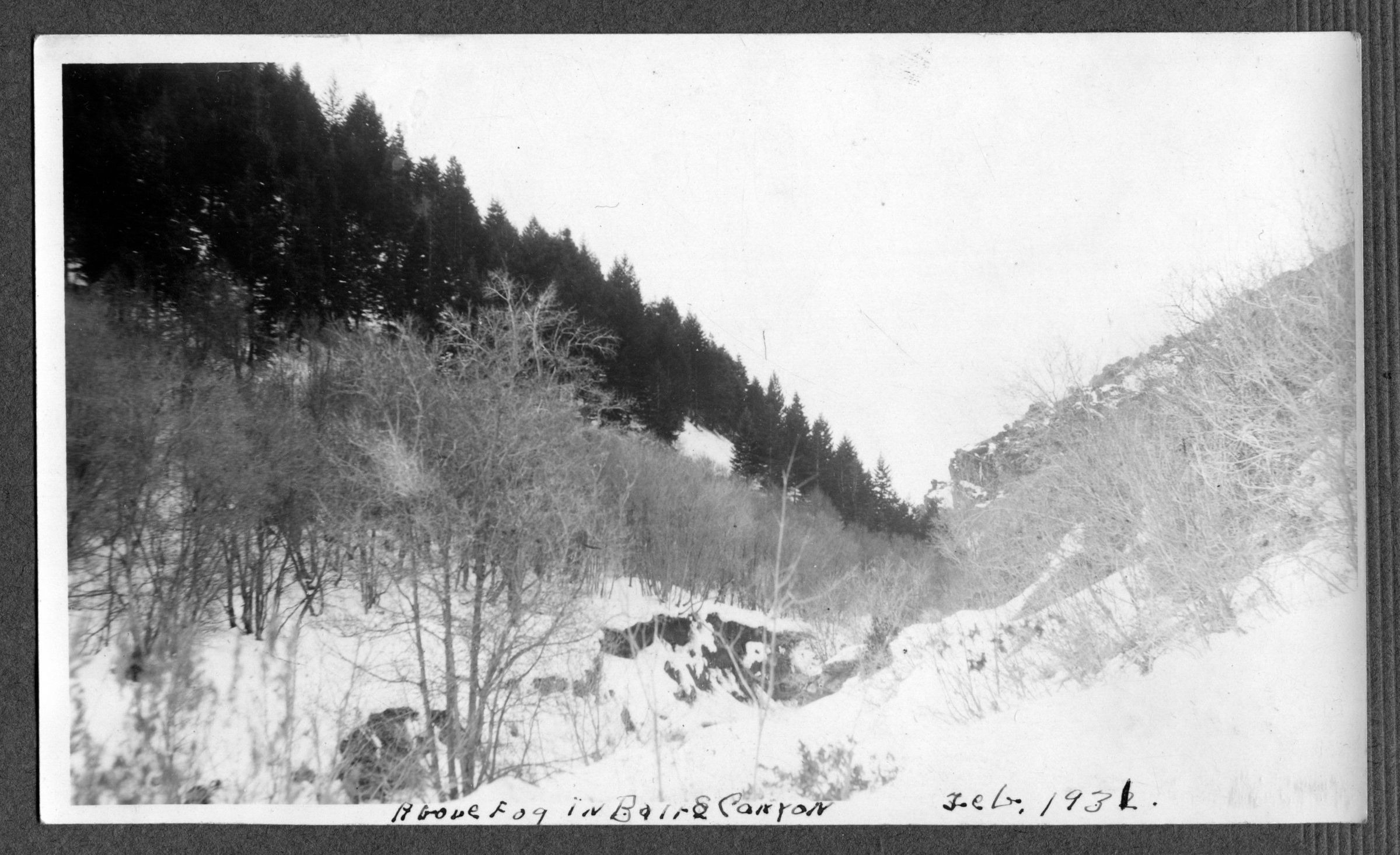 Evergreen tree line in Bair Canyon. Viewpoint looks down into fog-filled valley over Kaysville.