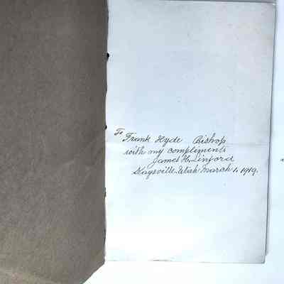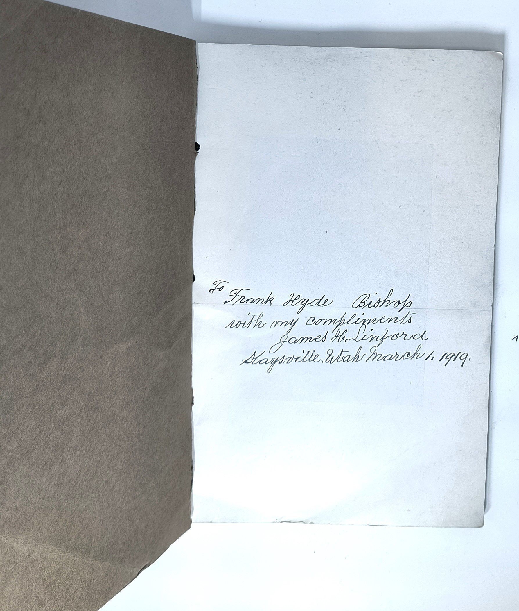 To Frank Hyde Bishop with my compliments James H. Linford Kaysville Utah March 1.1919Language