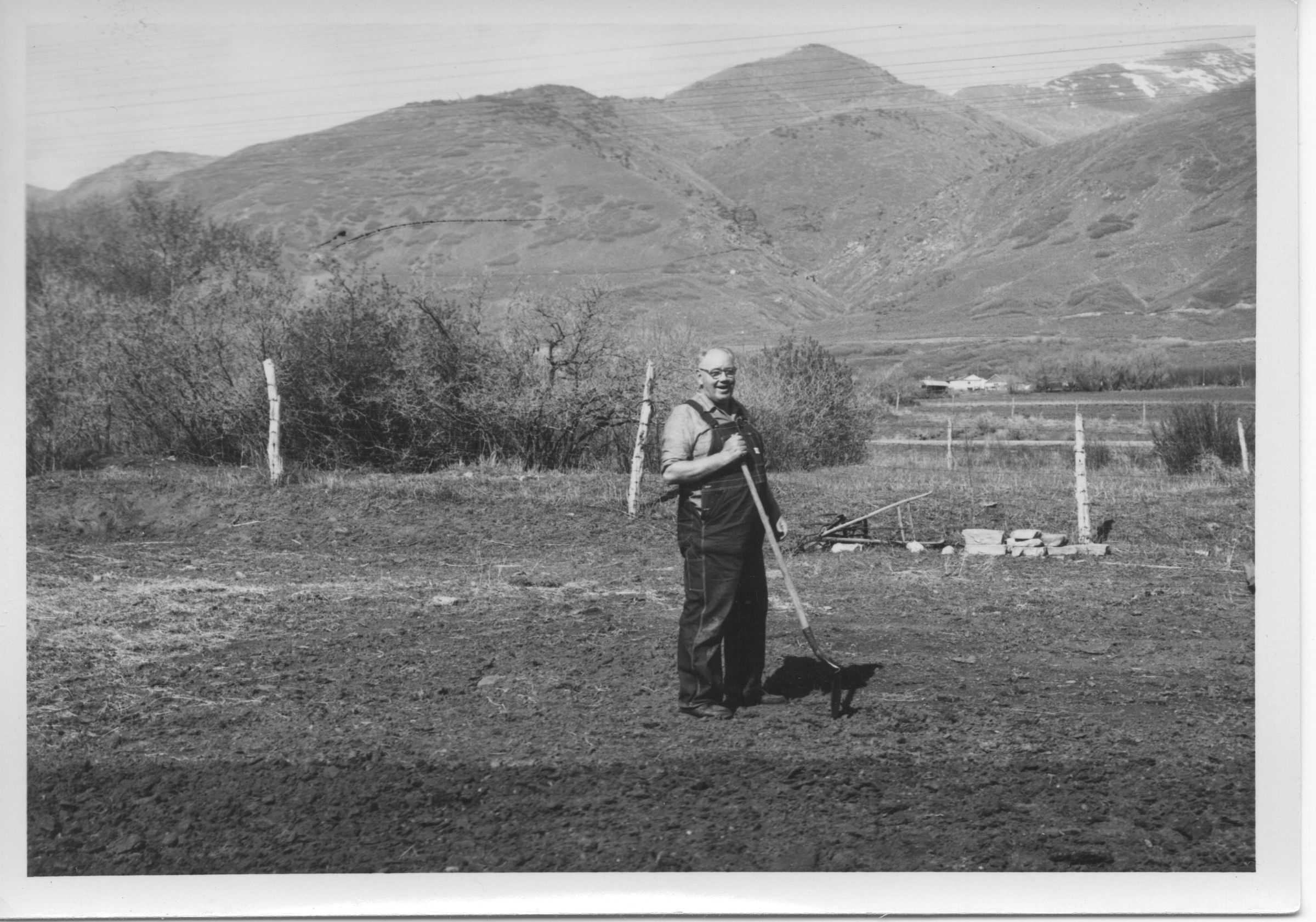 Alpheus Harvey on the family farm west of Highway 89 in Fruit Heights. The field is on the south side of Dry Hollow.Photograph Details