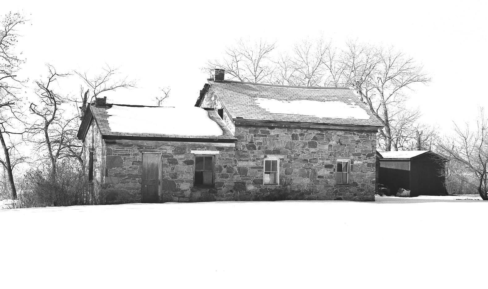 Rock house belonging to pioneer Grandison Raymond on Mountain Road in Kaysville surrounded by snow and trees.Photograph Details