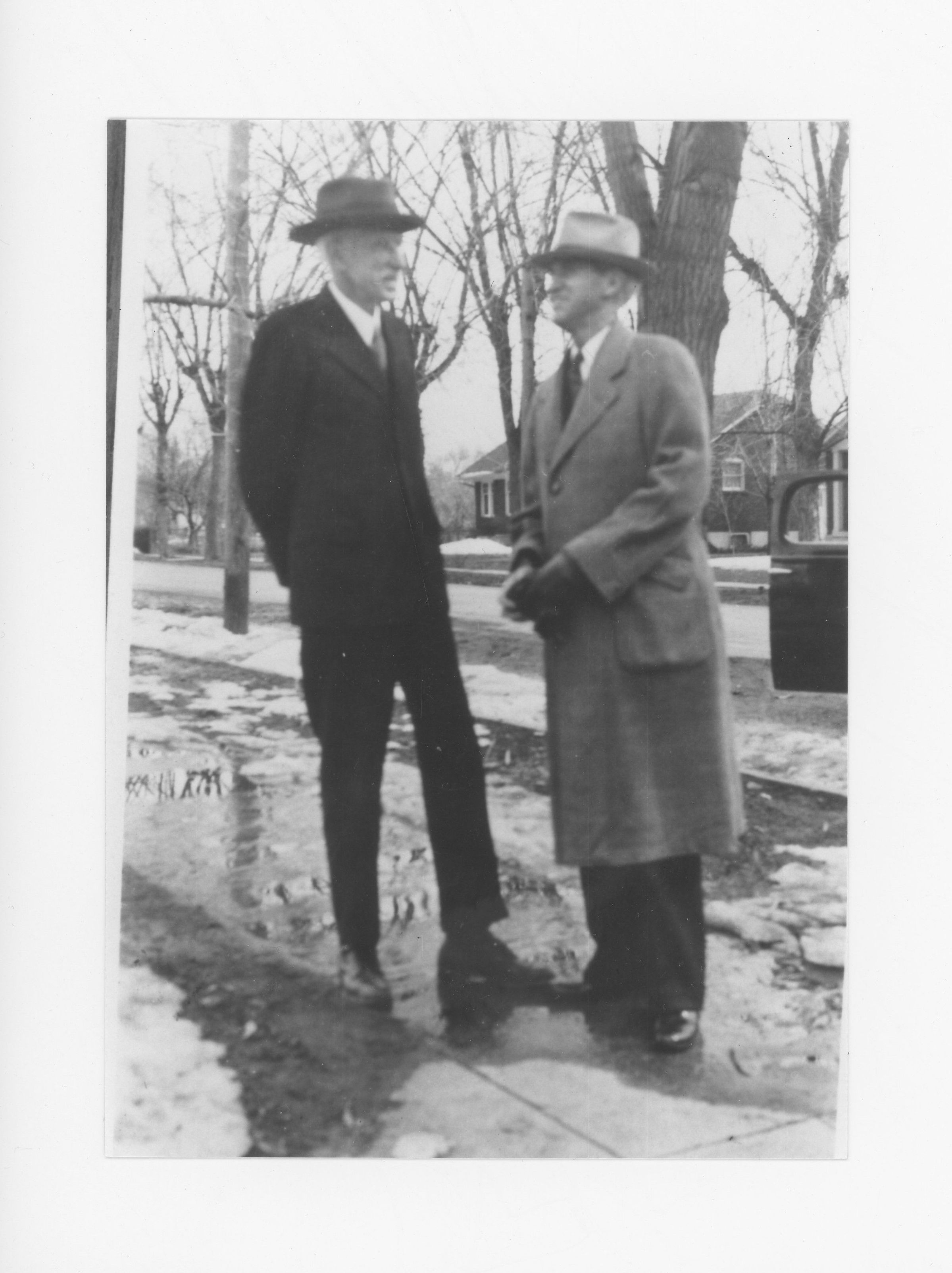 Dr. Gleason and Mr. Seth C. Jones on the sidewalk in front of the Kaysville LDS Tabernacle.Photograph Details