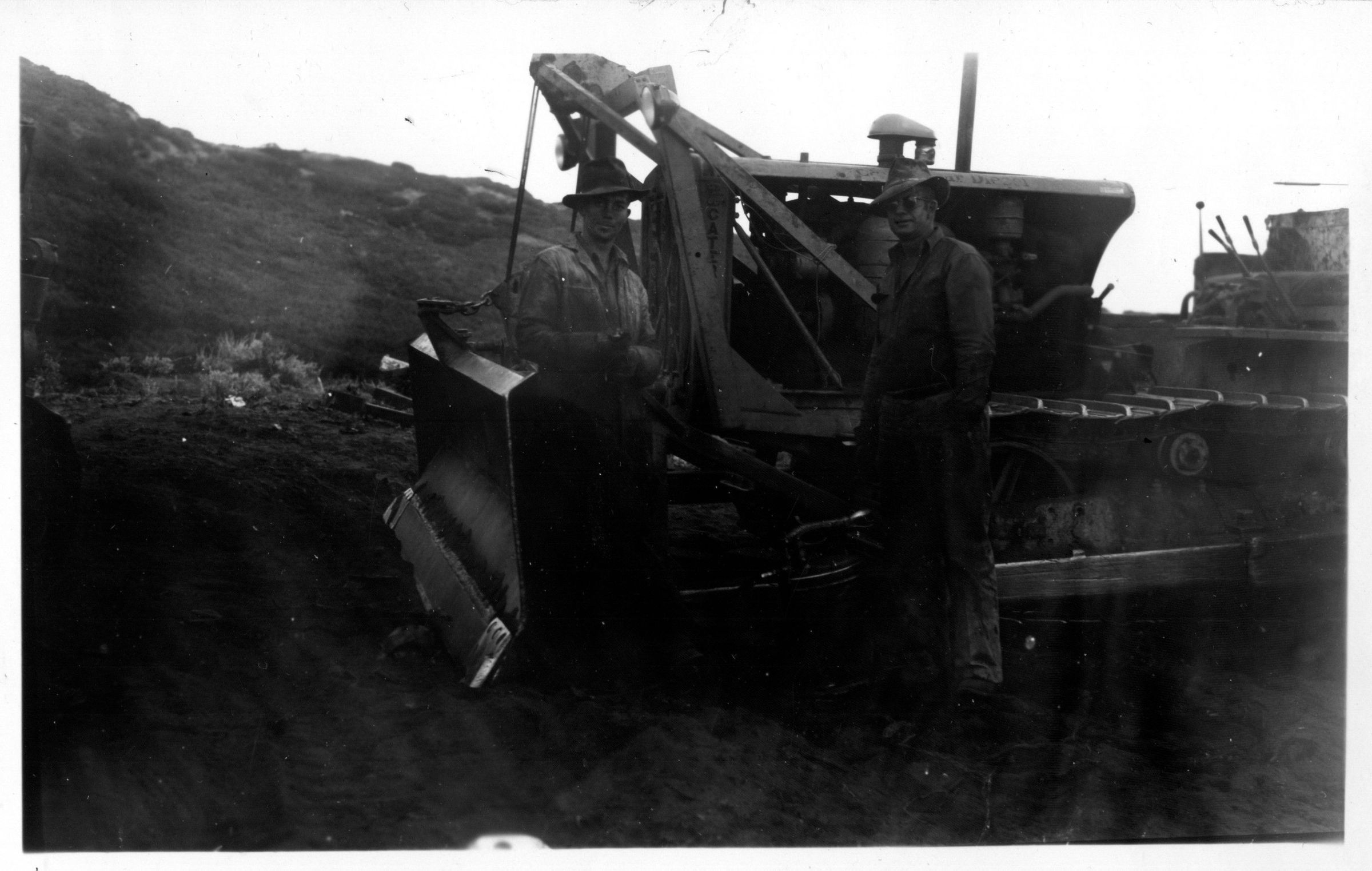 Vern Butcher and co-worker standing beside large machinery.Photograph Details