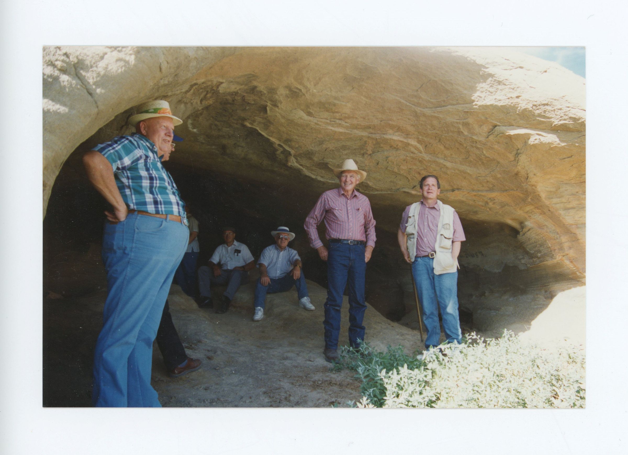Sons of Utah Pioneer members rest in the shade of Cache Cave during tour. L to R: Mar Fawcett, Harris Adams with Dr. Hoeness.Photograph Details