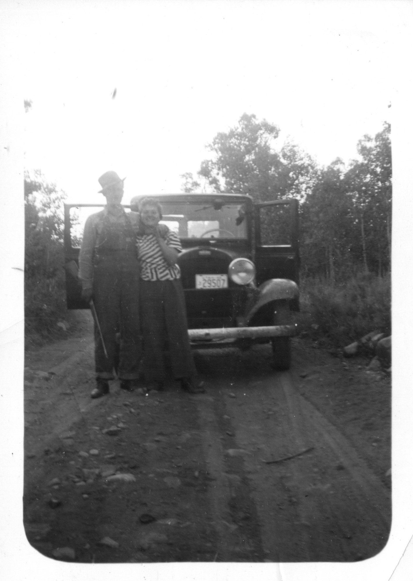 Carl and Carrie Butcher standing together next to a car on a dirt road.Photograph Details