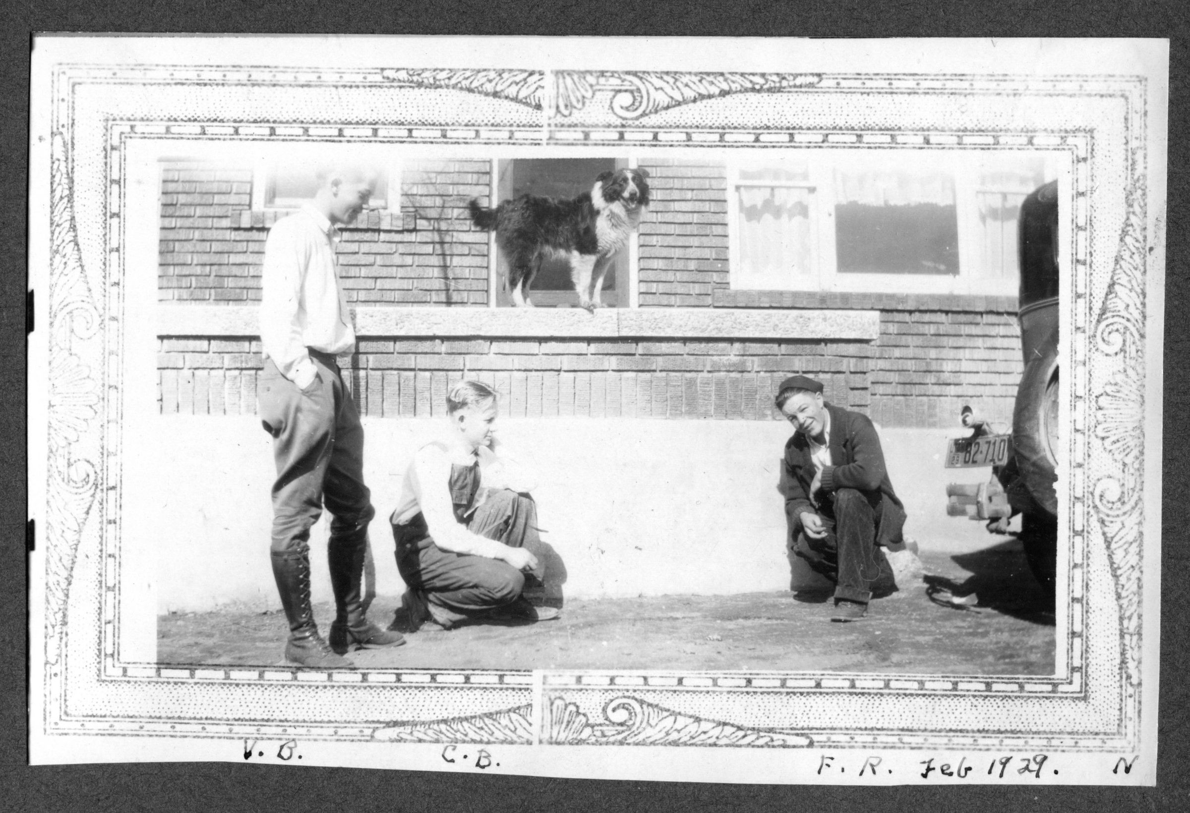 Three friends outside of Butcher home. Vern Butcher, left; Carl Butcher, center; and Frank Robins, right, were cousins and friends, all living in Kaysville. The Butchers lived on the Old Mountain Road which went through what is now Fruit Heights.Photograph Details